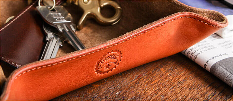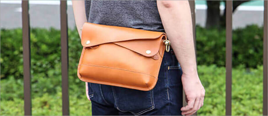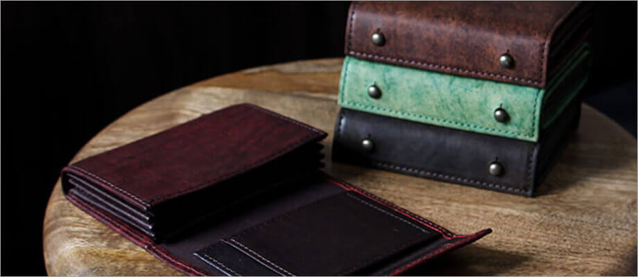 ウィスキーのスキットルをモチーフにしたデザインとエイジングが楽しめるレザーが魅力。