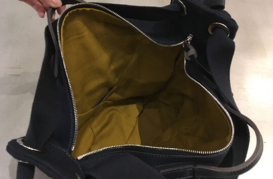 底面が正方形になっているので、充分なマチ幅があり、収納力は抜群です。クロスになった底面は耐久性もあり、安心して使えます。
