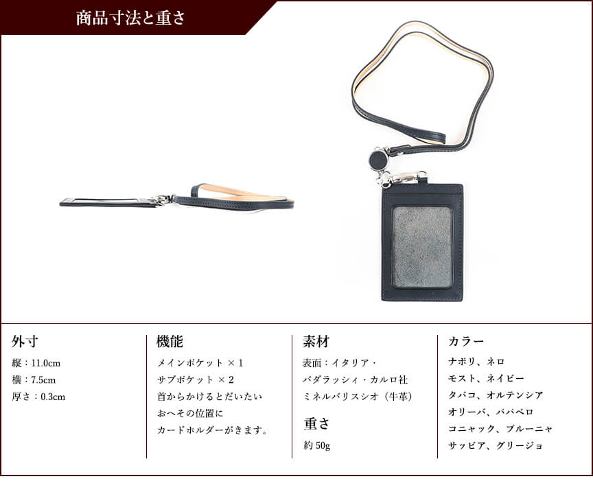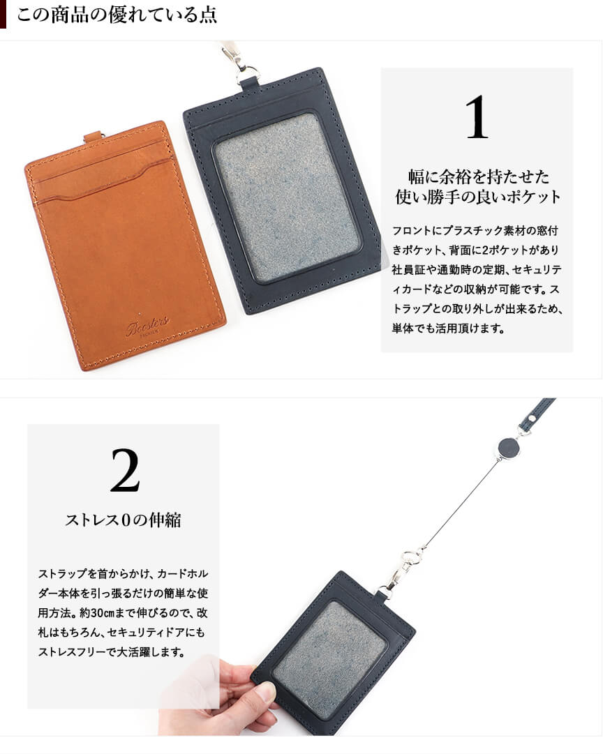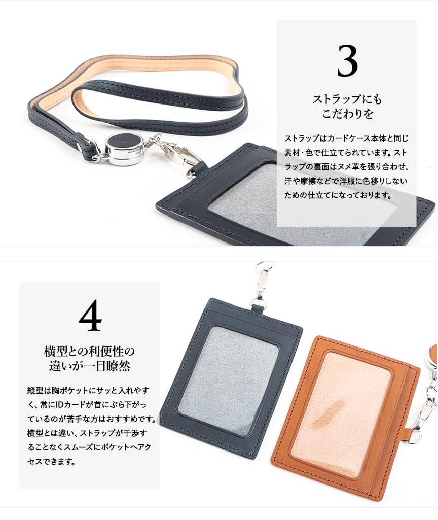 首から下げるIDではなく、バッグに入れる定期券入れとして購入しました。なので、ストラップの革部分はもっと短い物も選択出来るようになるといいな、と思いました。