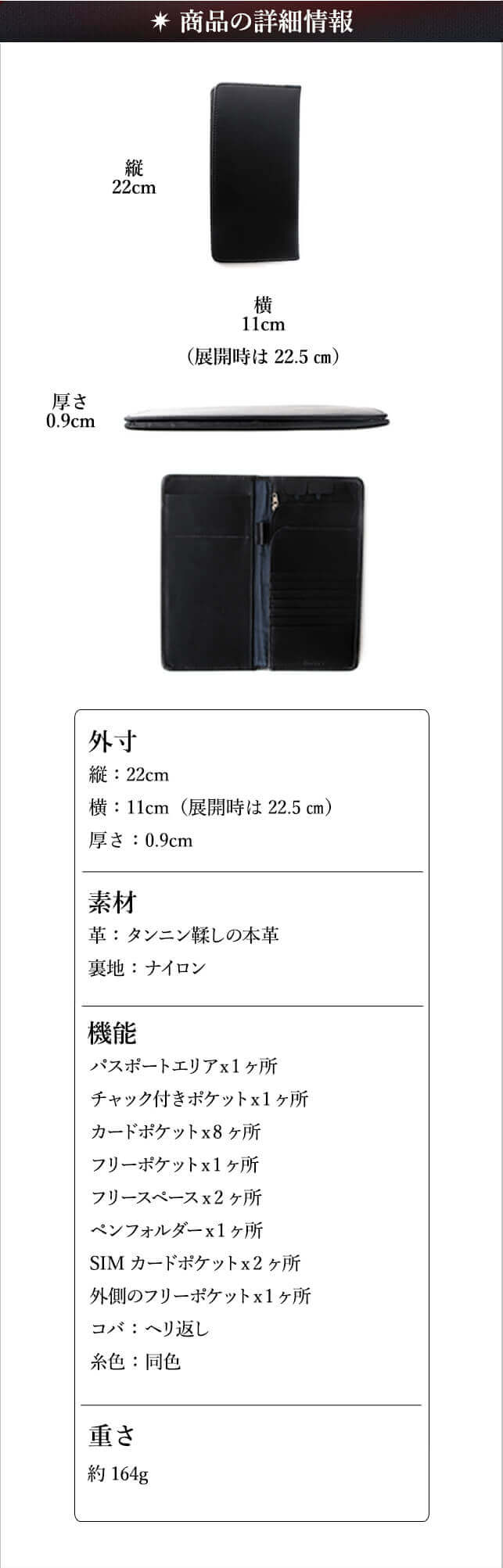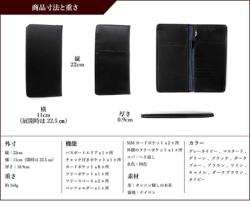 【サイズ】縦22cm×11cm展開時は22.5?×0.9cm【重さ】約164g【素材】タンニン鞣しの本革【生産国】バングラディッシュ【仕様】パスポートエリアx1ヶ所チャック付きポケットx1ヶ所カードポケットx8ヶ所フリーポケットx1ヶ所フリースペースx2ヶ所ペンフォルダーx1ヶ所SIMカードポケットx2ヶ所外側のフリーポケットx1ヶ所コバ:ヘリ返し糸色:同色