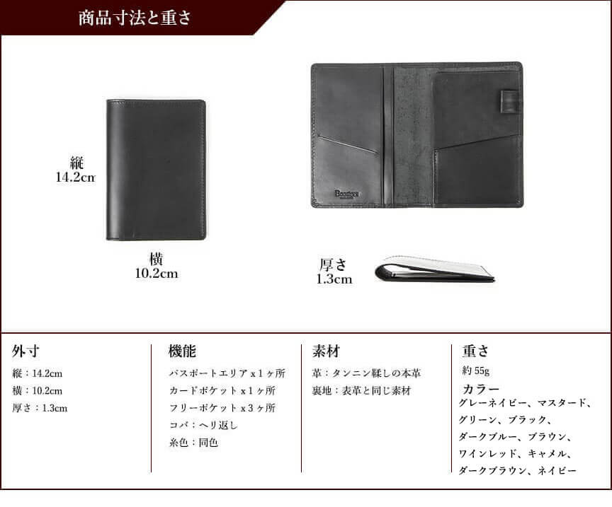 【サイズ】W14.2×H10.2×D1.3 (mm)【重さ】約55g【素材】タンニン鞣しの本革【生産国】バングラディッシュ【仕様】パスポートエリア1箇所と別に、カードポケット1箇所、フリーポケット3箇所があります。