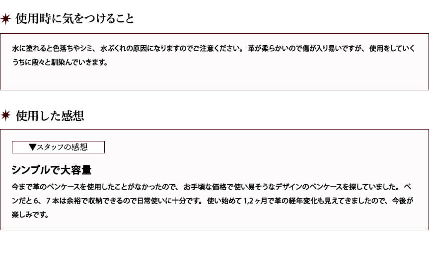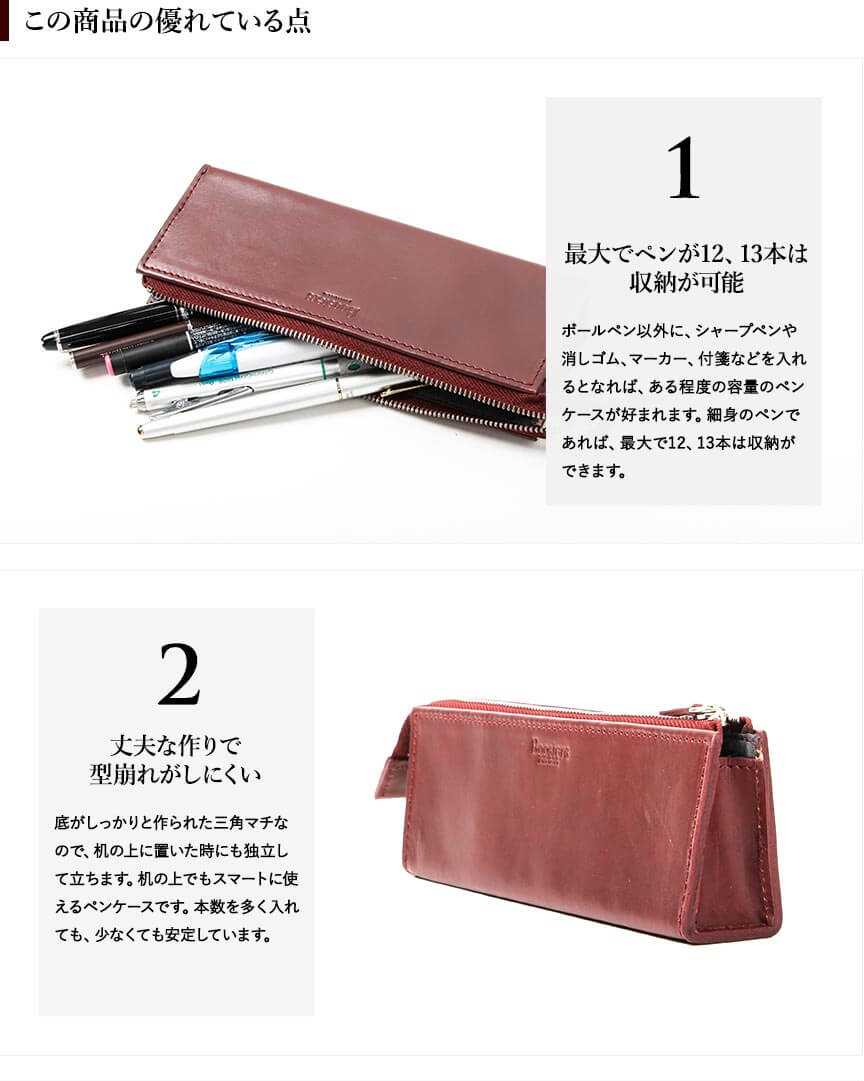 デザインや大きさが、探していたペンケースの理想とマッチしていたので購入させて頂きました。皮が固いので使い込んで柔らかくなる経過を楽しみたいと思いますが、最初から柔らかいペンケースをお探しの方には合わないかもしれません。 商品の評価としては5を付けさせて頂きましたが、アマゾンでフリースピリッツさんが販売している同商品が半額以下だったのを後から見て、ちょっとモヤモヤしました。