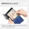 紙幣は、コインケースの裏側にあるポケットに差し込むだけ。カードスロット付きの札ばさみでしっかりと固定します。お札に折り目がつかないので、お支払い時もスマート。約10枚の紙幣を収納でき、見た目以上の大容量です。