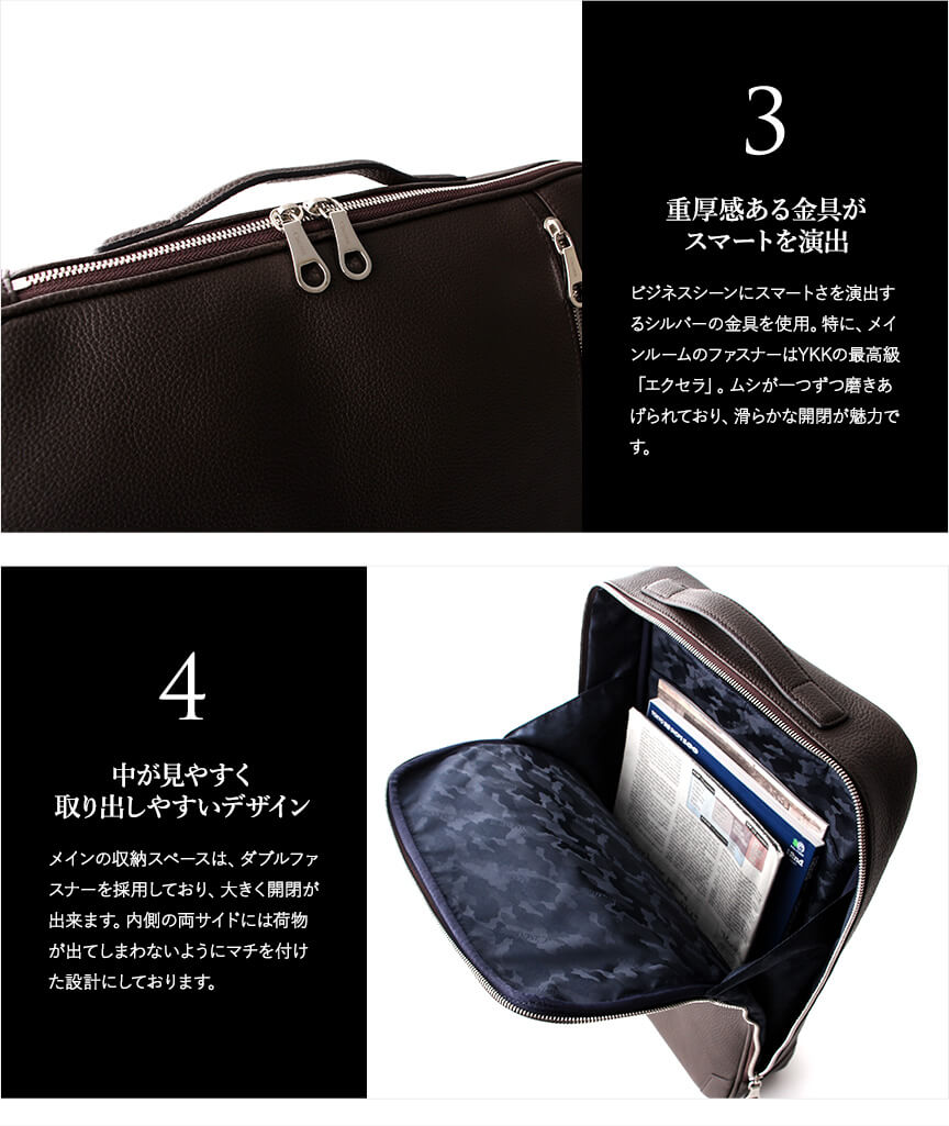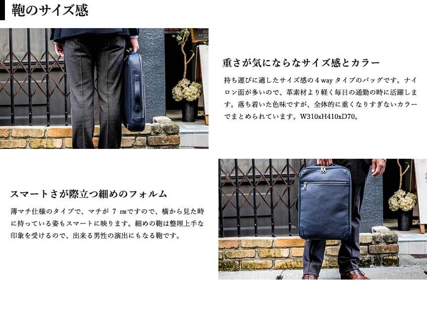 薄い造りは電車通勤に適している。ただ枠の強度が強くないのでノートパソコンを入れると全体が歪みファスナーの開閉がスムーズにならなくなる。なので頻繁に開閉しないのであれば問題はない。