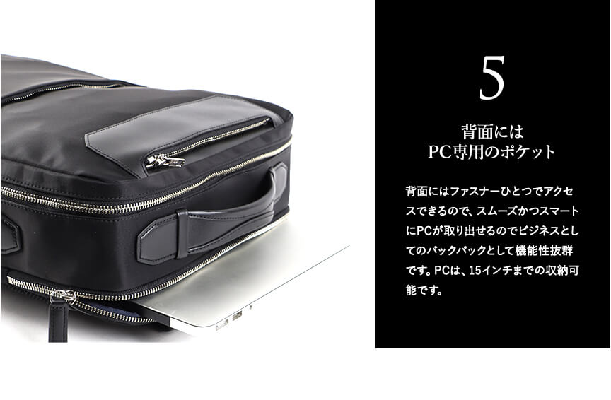 ・ファスナーポケット×2、PC用コンパートメント、ショルダーストラップ収納ポケット×1