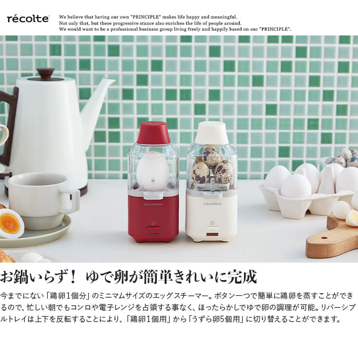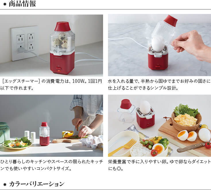 卵と水を少量入れ、スイッチを押すだけ! 半熟卵~固ゆで卵まで、お好み通りにきれいに仕上がるコンパクトなゆで卵メーカー。