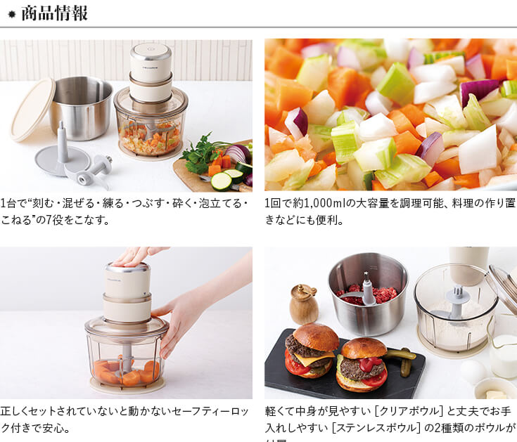 2種類のボウルと3種類のアタッチメントが付いた 1台で“刻む・混ぜる・練る・つぶす・砕く・泡立てる・こねる”の 7役をこなす、大容量の多機能フードプロセッサー。