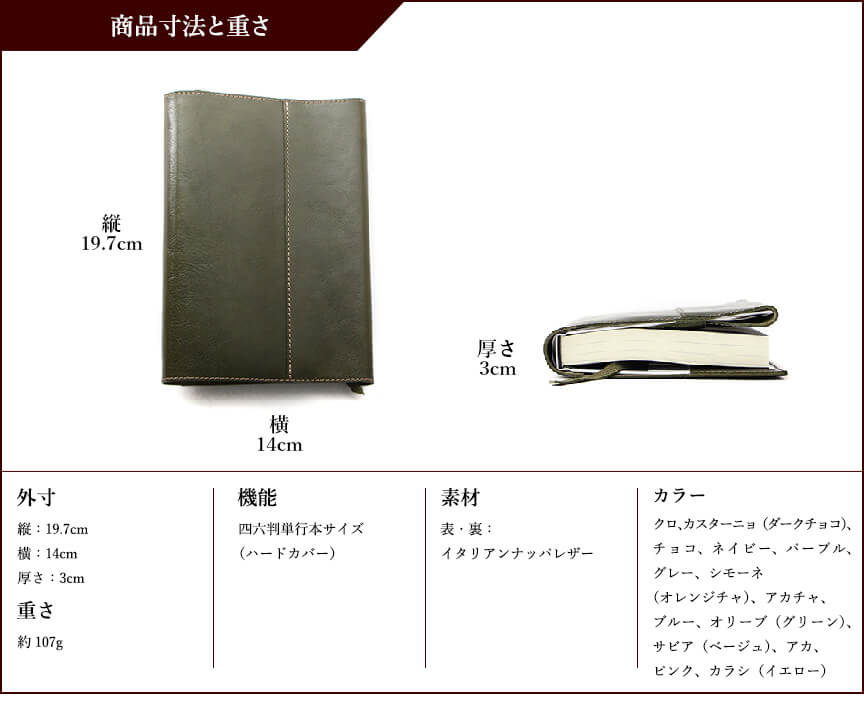 四六版サイズで、表紙が厚紙タイプだとぴったりだが 表紙が紙タイプだとぶかぶかだった。 ちゃんと見てから買うべきだった(@_@) 皮の質感と匂いはすごくよくて 経年変化は楽しみです!!