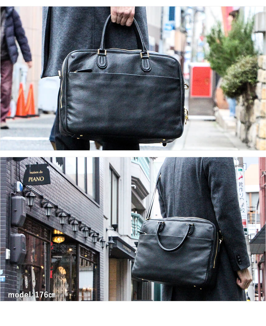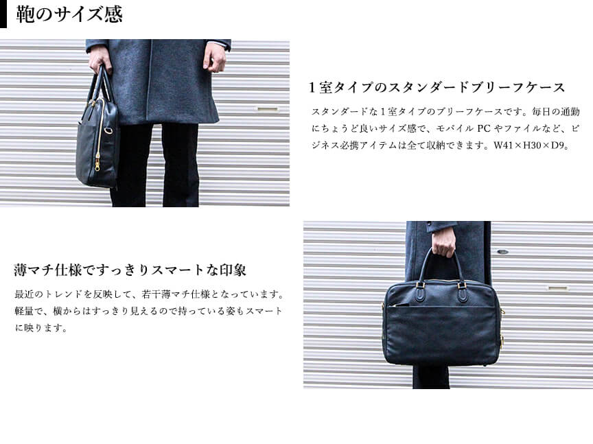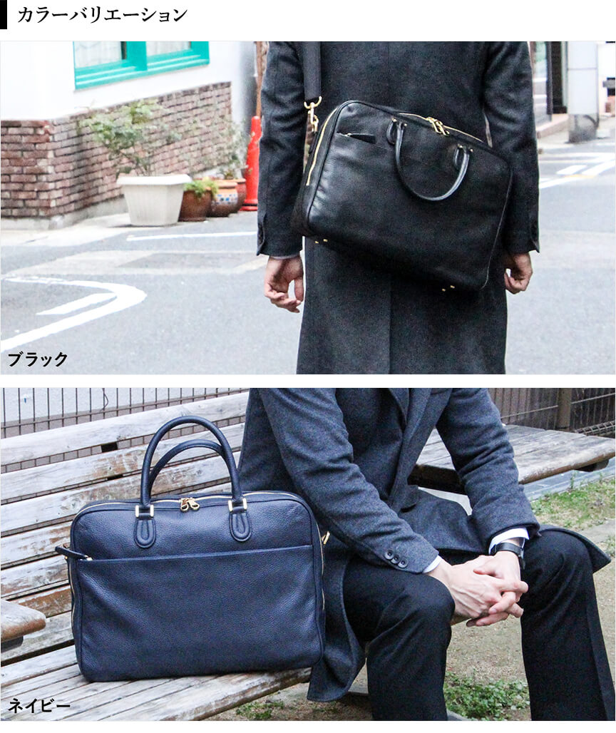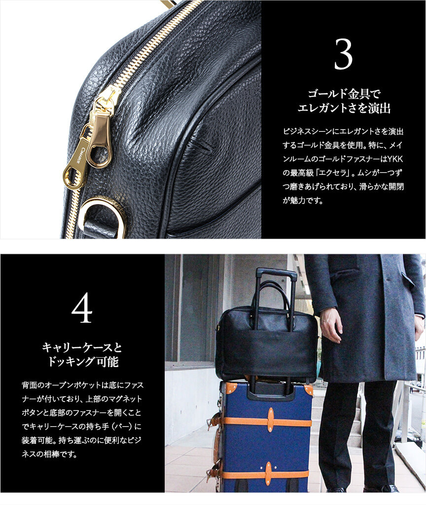 キャリーケースのバーに装着して持ち運べるつくりになっており、出張時にも活躍する使い勝手のいいブリーフケース。