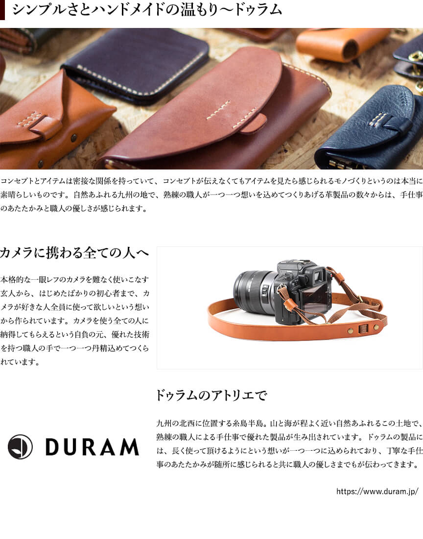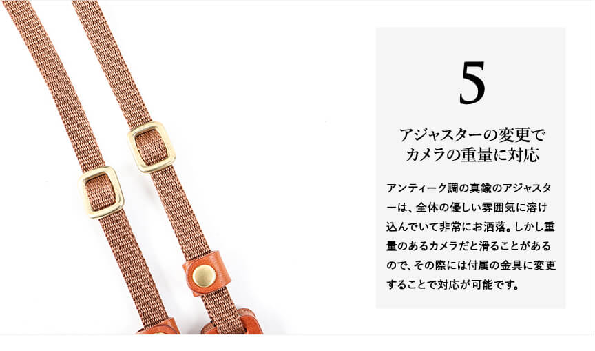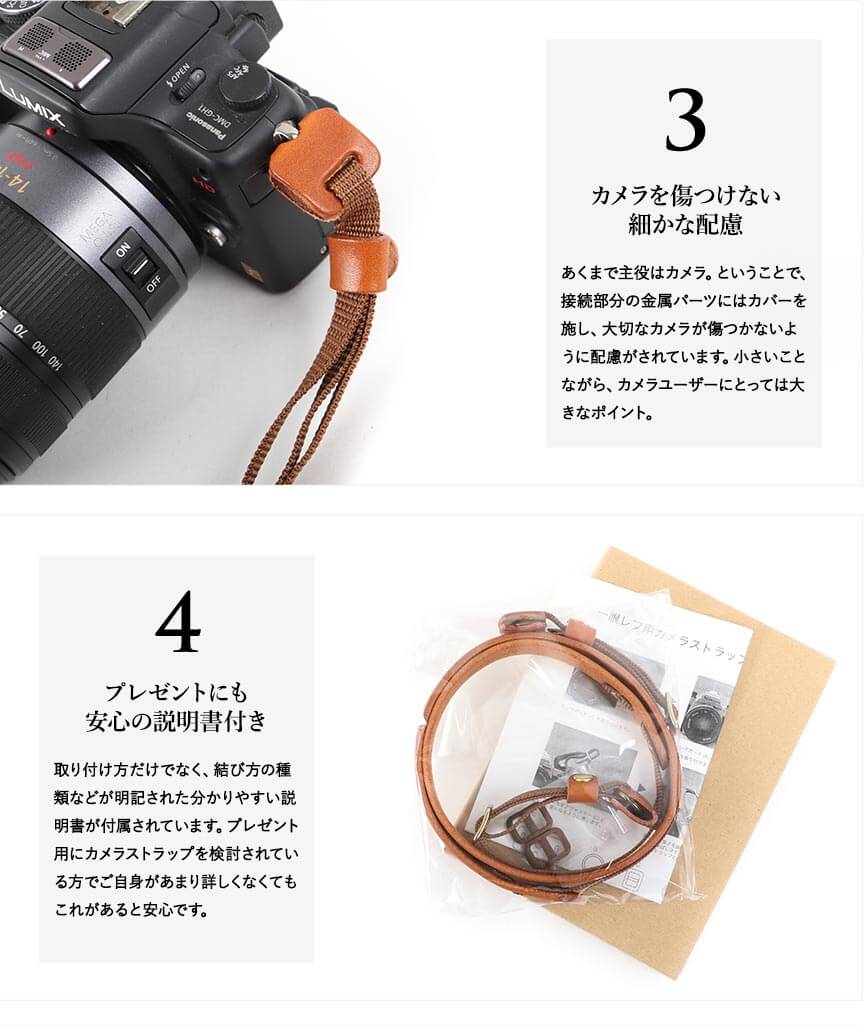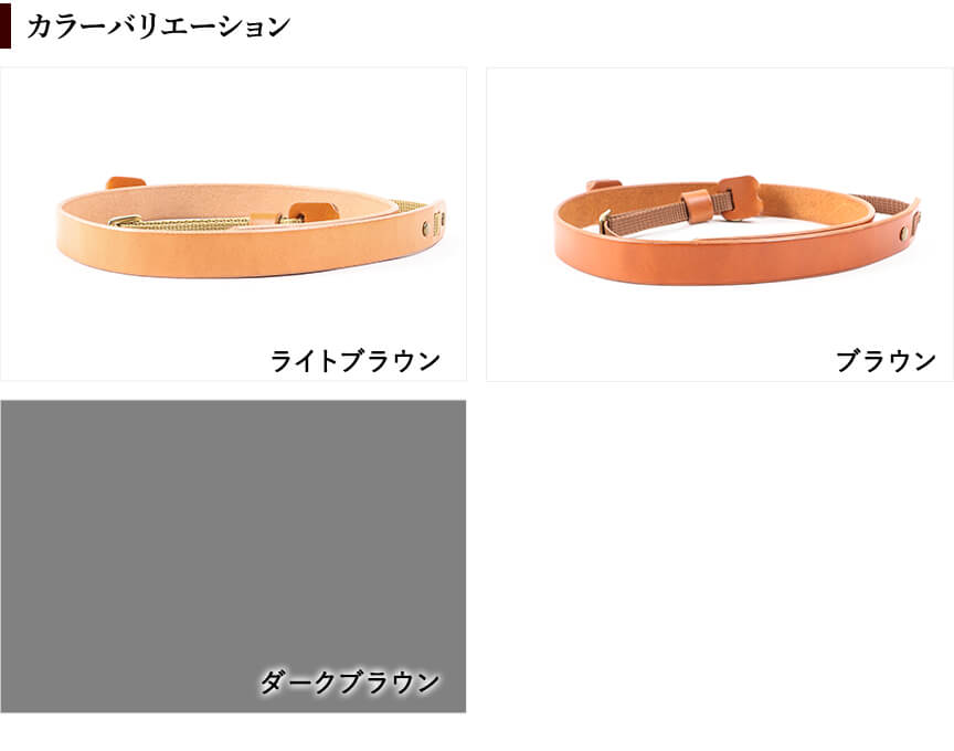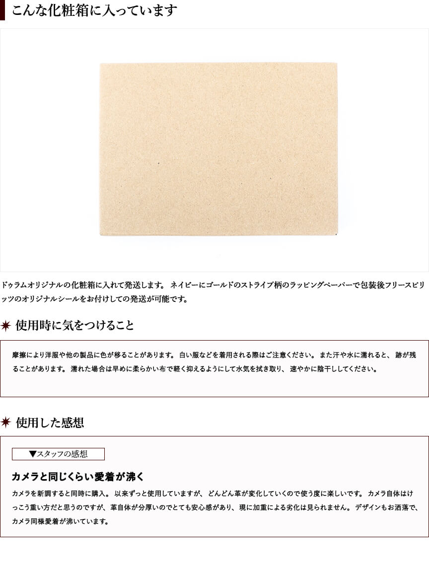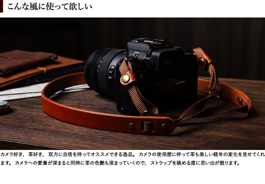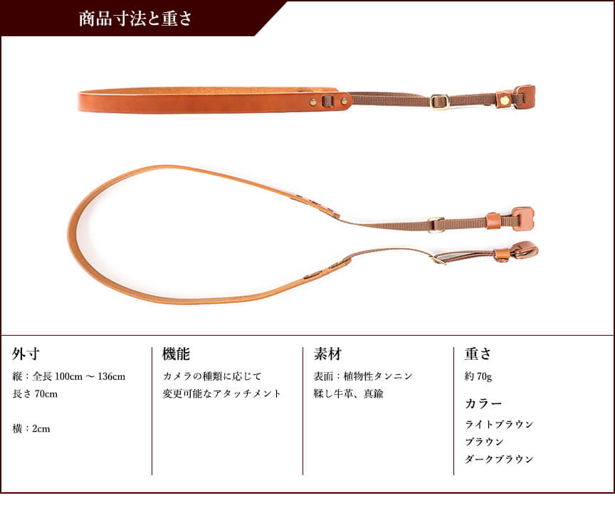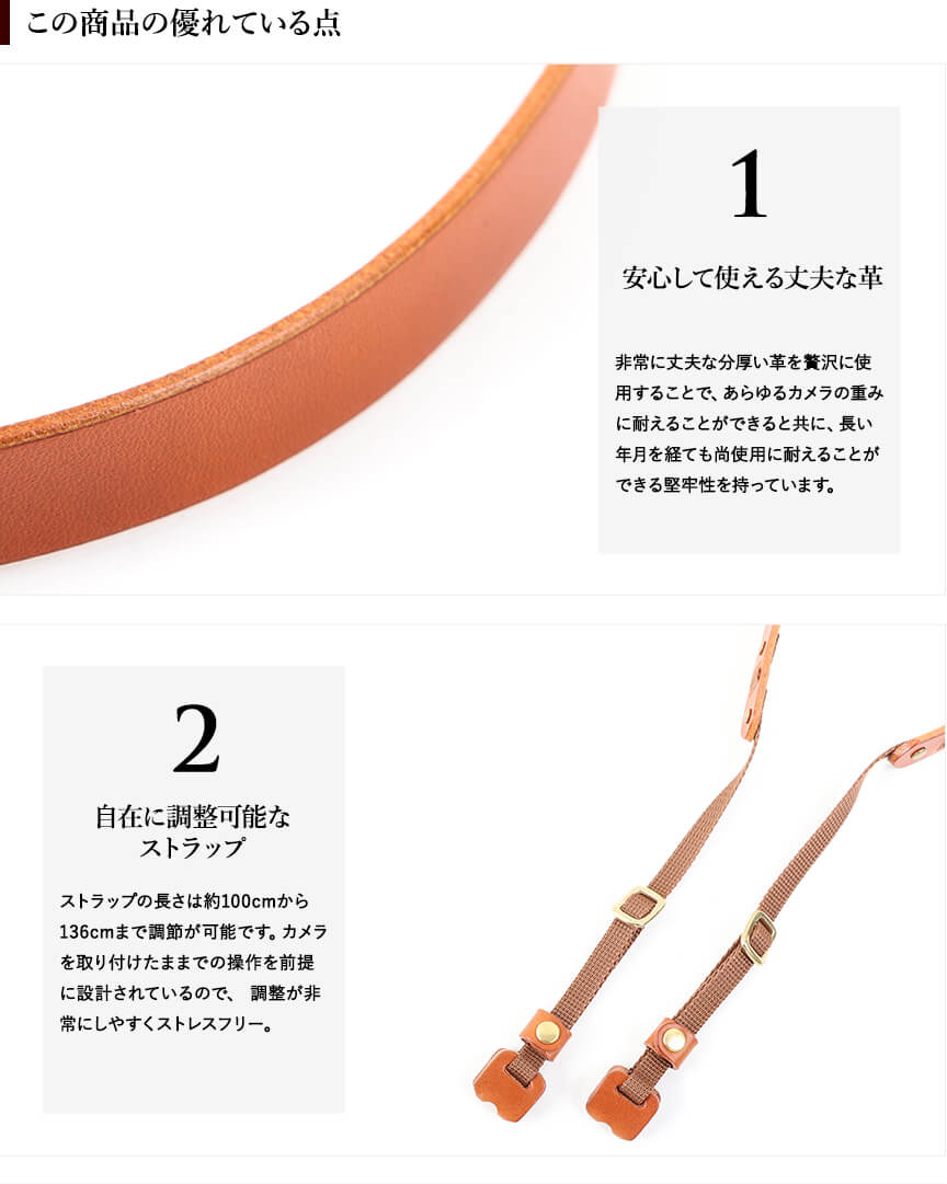一眼レフ用* 耐荷重5kg(革の経年劣化により長期ご使用いただくと多少変化します) ストラップの長さは約100 ~ 136cmまで調節可能この製品は革本来の風合いを活かすためにタンニン鞣しの多脂革を使用しています。天然素 材を使って染めているため摩擦などで色落ちして衣類などを汚す場合があります。また、革本来の小傷やシミ、シボ(しわ)などが目立つ場合もございますが自然な風合いとしてご理解ください。
