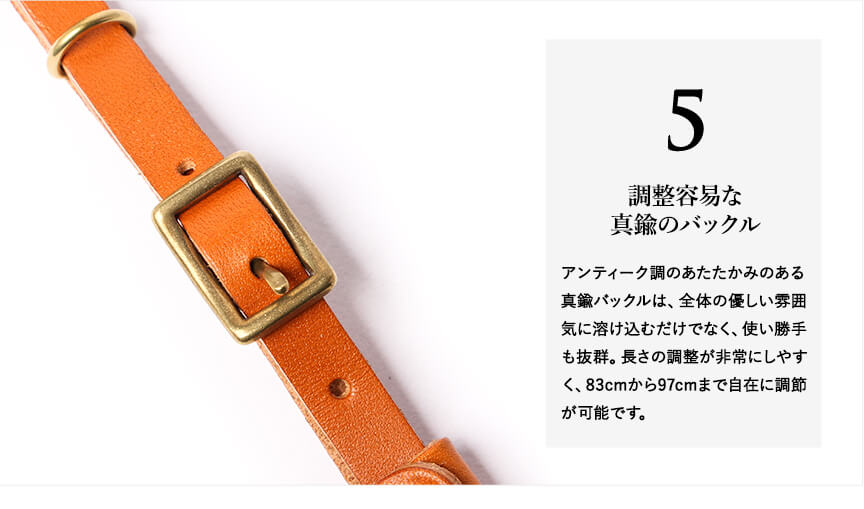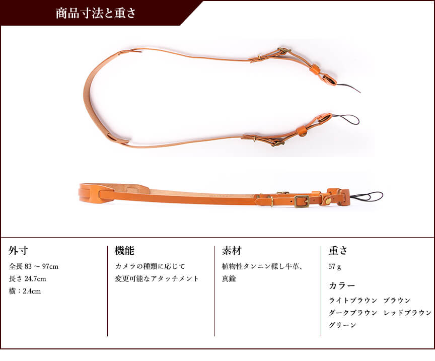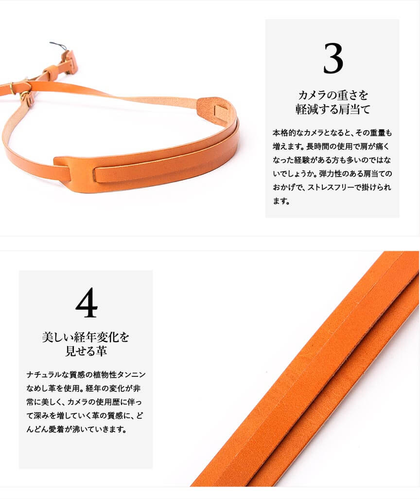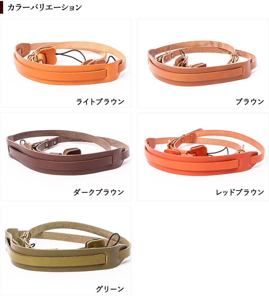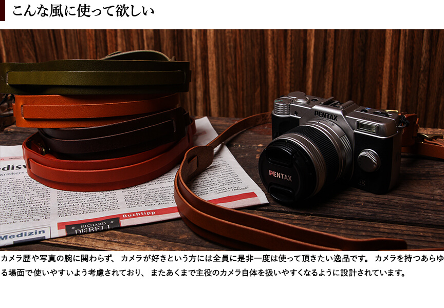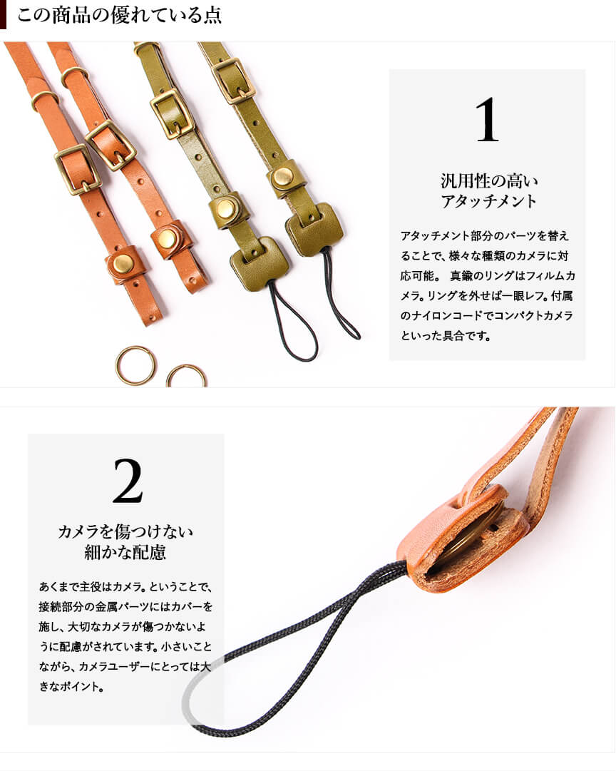 「ハンドメイドによる生産のためにお届けまでに10日間ほど頂く場合があります」ナチュラルレザーを使用しているため、色むら、シワ等がある場合がございます。ご容赦ください。革の雰囲気と真鍮のバックルがよく合うナチュラルな雰囲気のレザーカメラストラップ。 かわいい小さな肩当てが印象的ですが、これがあるので一眼レフでも使用することができます。 長さは真鍮のバックルによって83cmから97cmまで調節可能です。 アタッチメント部分のパーツを付け替えることで、いろいろなカメラに対応します。 例えば、真鍮のリングはフィルムカメラ。リングを外せば一眼レフに。ナイロンコードでコンパクトカメラにも使うことができます。