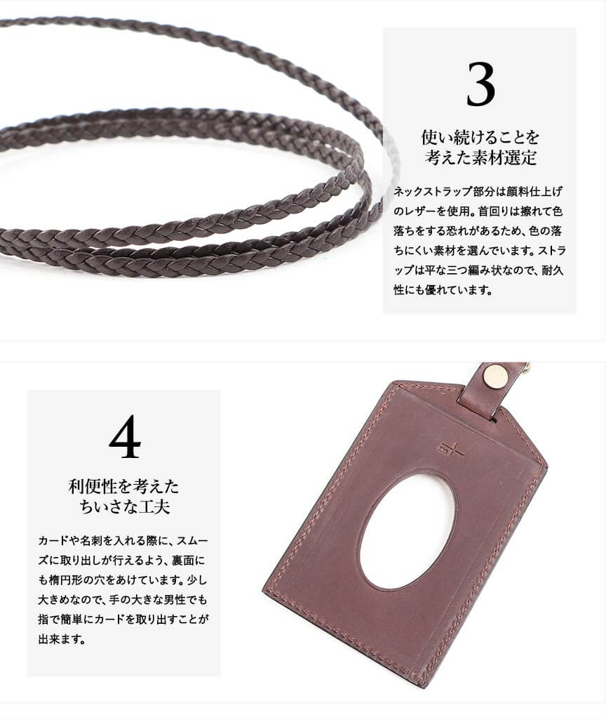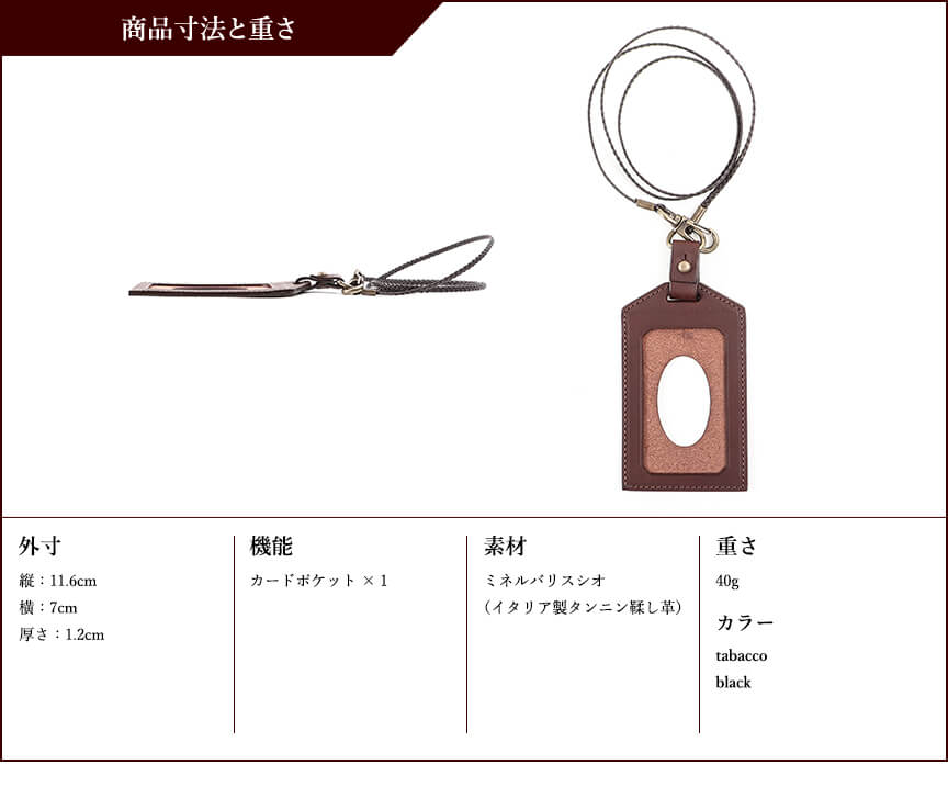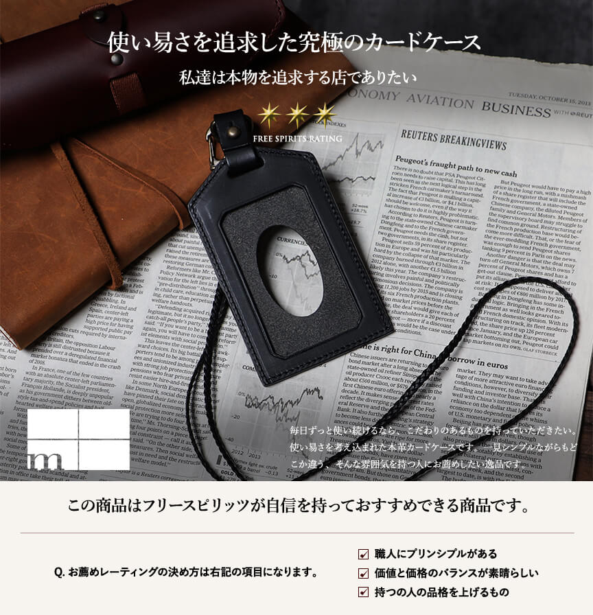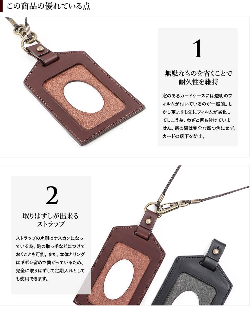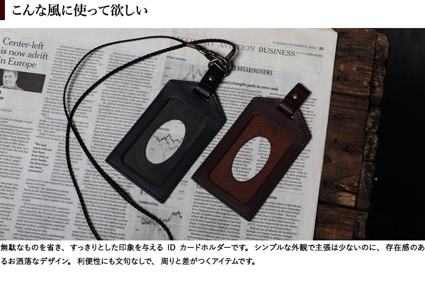 仕事中に社員証IDカードを首から下げるために購入しました。今までは使い捨てと割り切って、合皮製を使っていましたが劣化が激しかったため、今回初めて本革製を買いました。 本製品は質感やサイズ感がとてもいいです。ワイシャツのポケットにケース本体をスムーズに出し入れでき、使い勝手がよいです。ケース本体は硬めで、収納したカードの脱落や、ケースのヘタリの心配も無さそうです。ケースの角が塗料のようなもので補強されているので、角の傷みも少なさそうです。 気になった点は、ケースの窓に透明板などがないため、収納したカードが露出して汚れてしまう点です。