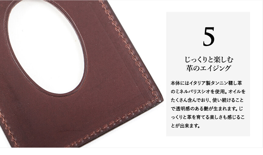 idカードをせっかく持つならと、薄めでかっこいいカード入れを探していたところ、写真を一目ぼれして購入。透明板が最初からないのは、長く使用するためのアイデアなのだと納得できます。革のエイジングを楽しみに使いたい。