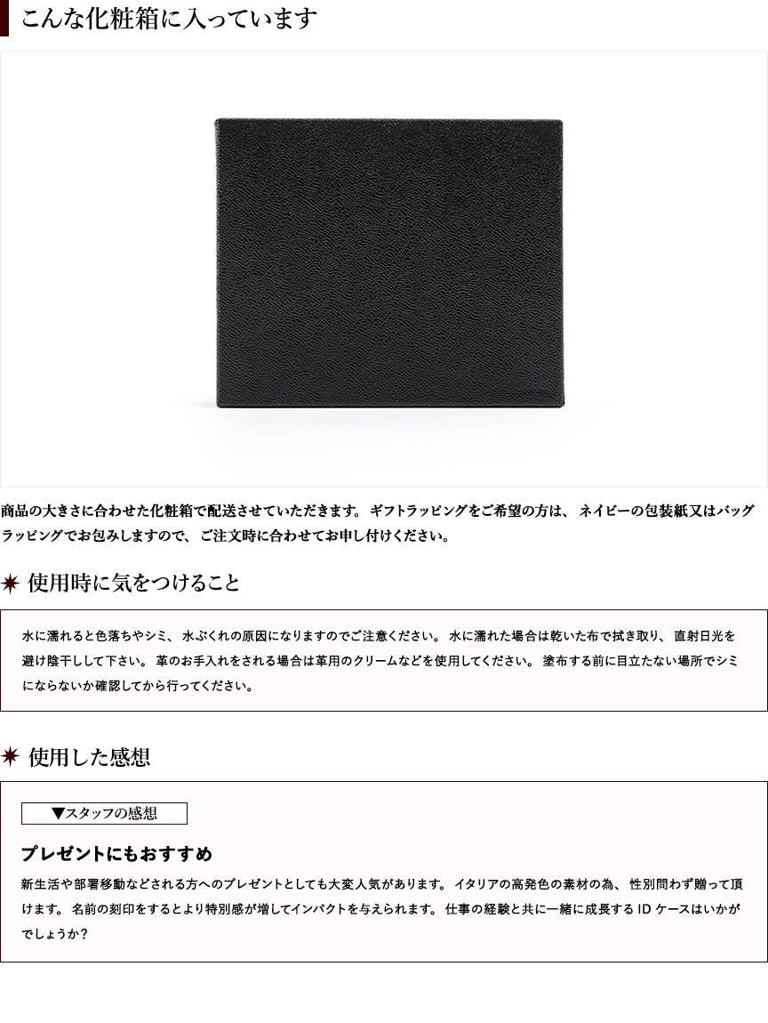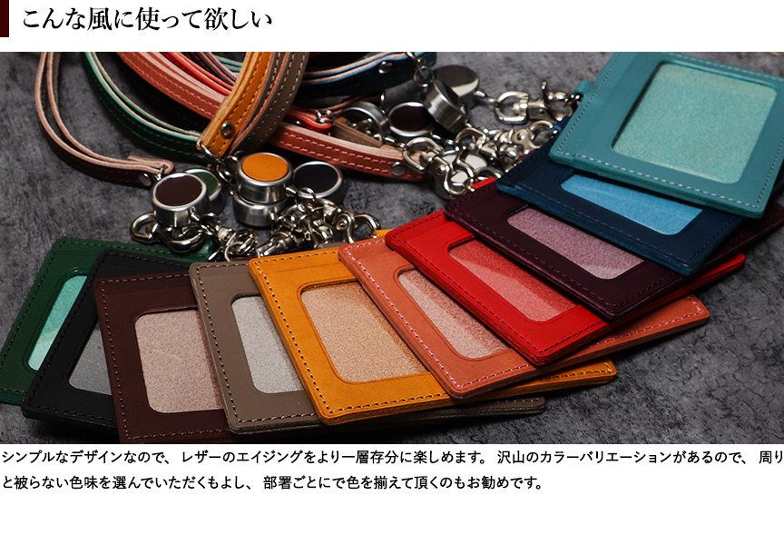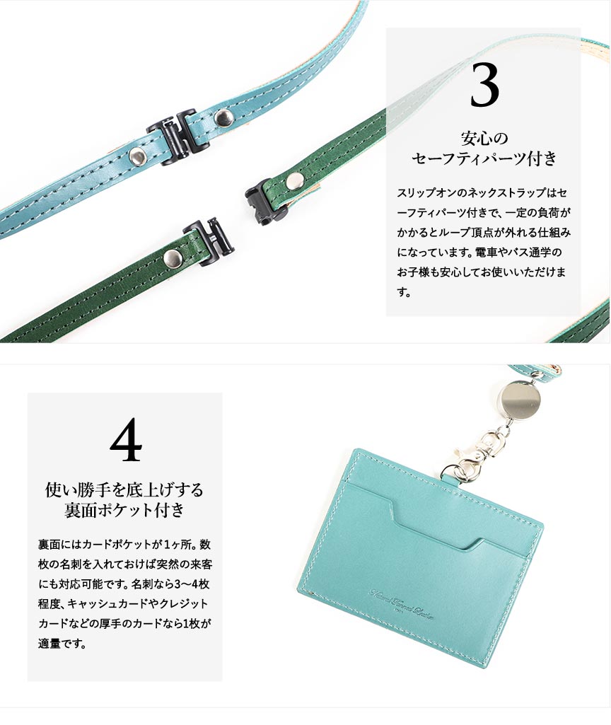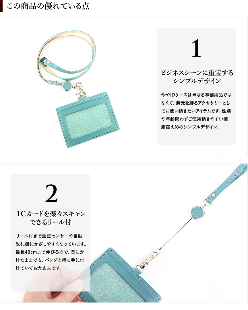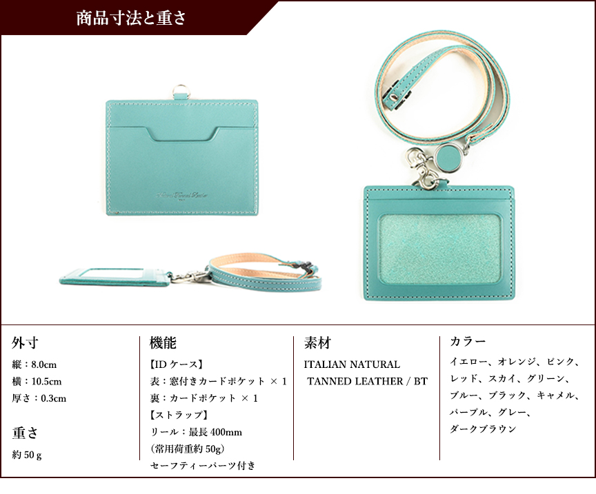●表面のマド付きカードポケット:有効内寸(おおよそ)高さ60mm×巾95mm×厚み2mm ●裏面のカードポケット:有効内寸(おおよそ)高さ50mm×巾95mm×厚み2mm、名刺が3~4枚程度、厚手のカード1枚収納可能 ●リール:最長400mm/常用荷重約50g