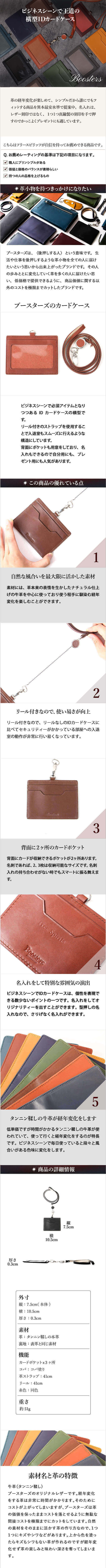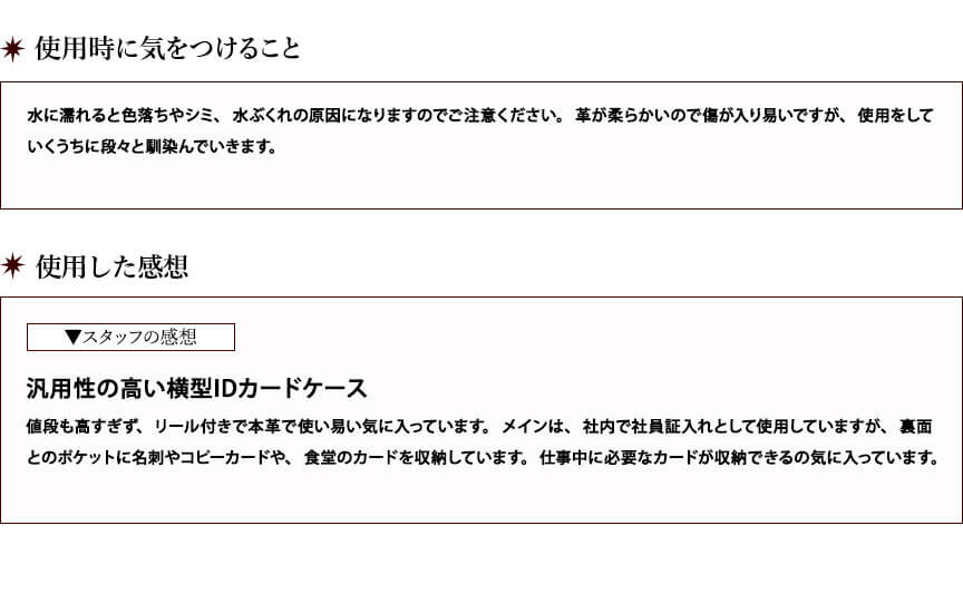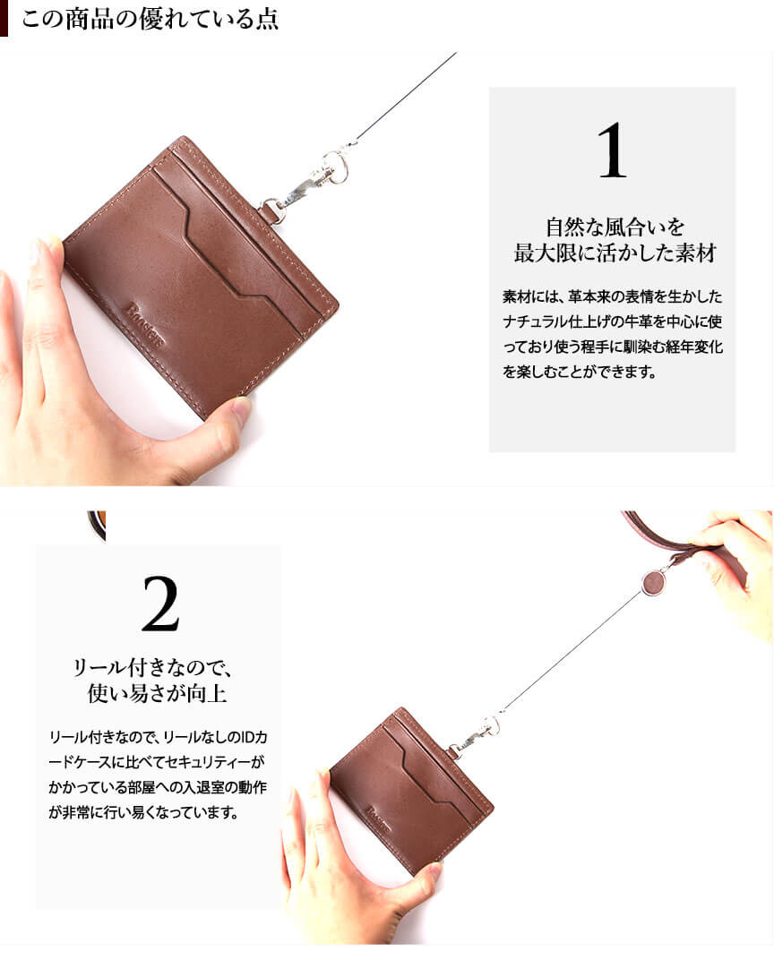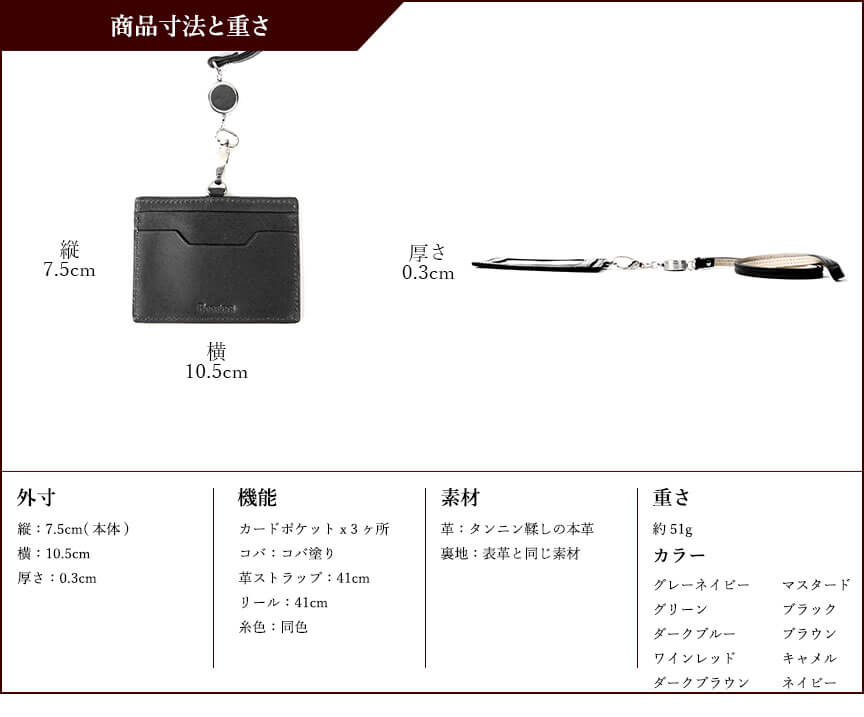 【サイズ】本体:約 縦7.5 x 横10.5 x 厚み0.3 mm ※突起部分含まず、リール部分41c、重量:約51g【素材】タンニン鞣しの本革【仕様】カードポケット3箇所、革ストラップ:41cm、リール:41cm