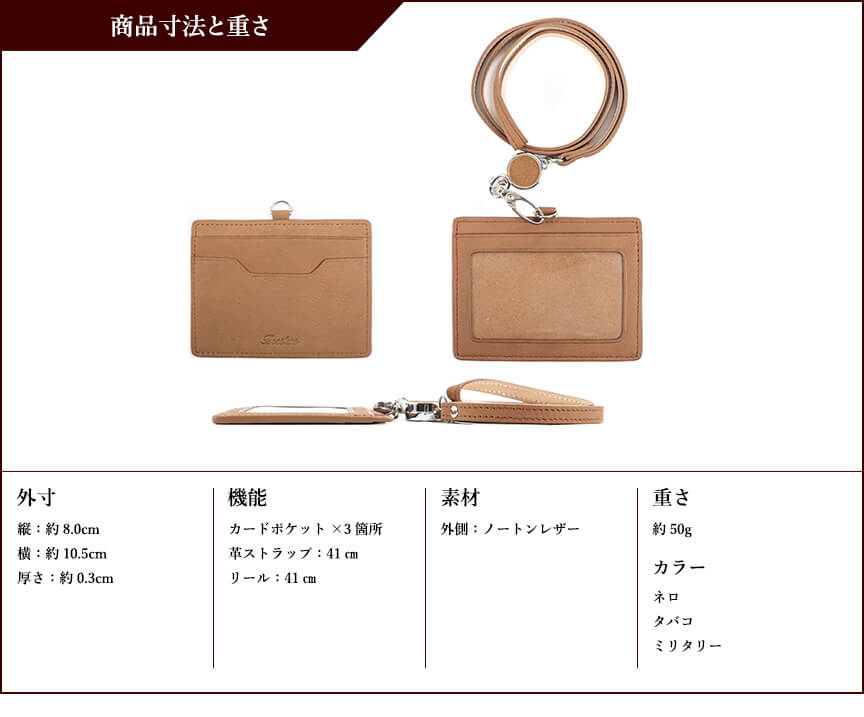 カードポケット3箇所、革ストラップ:41cm、リール:41cm