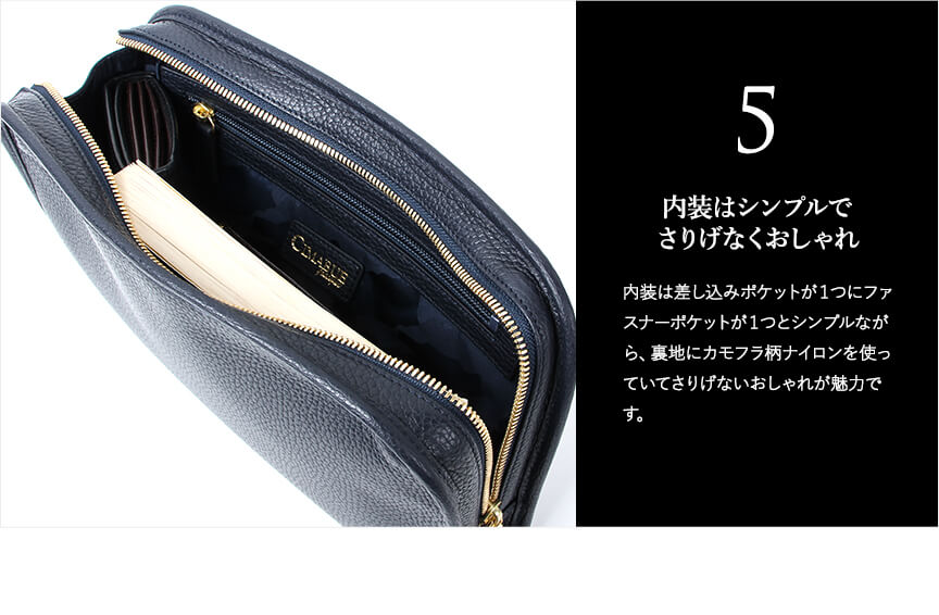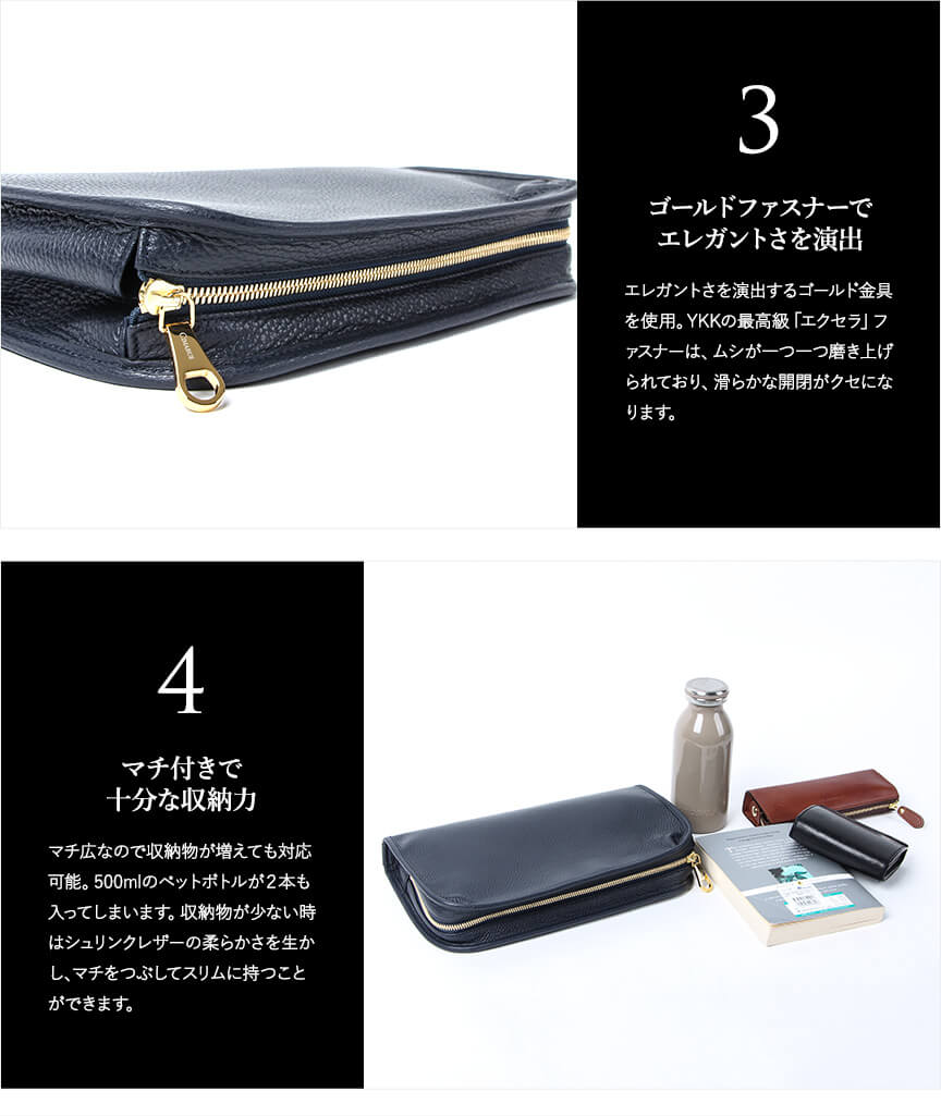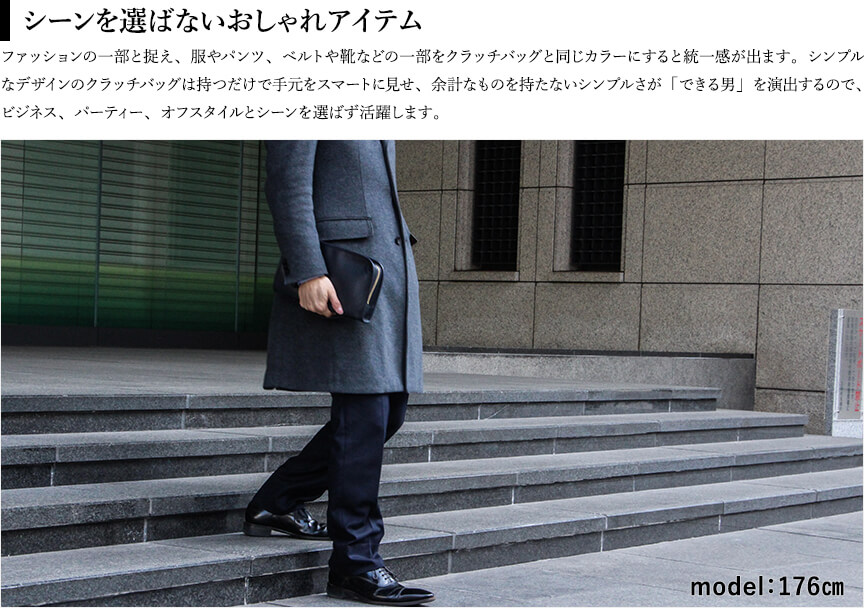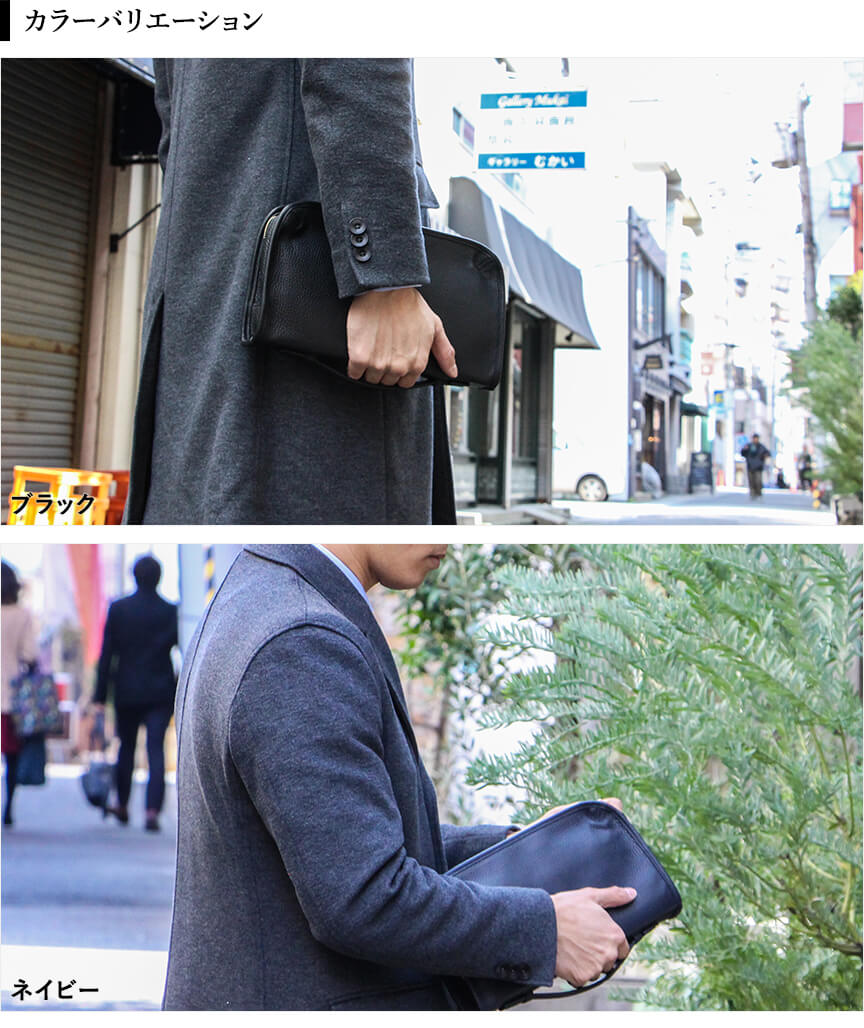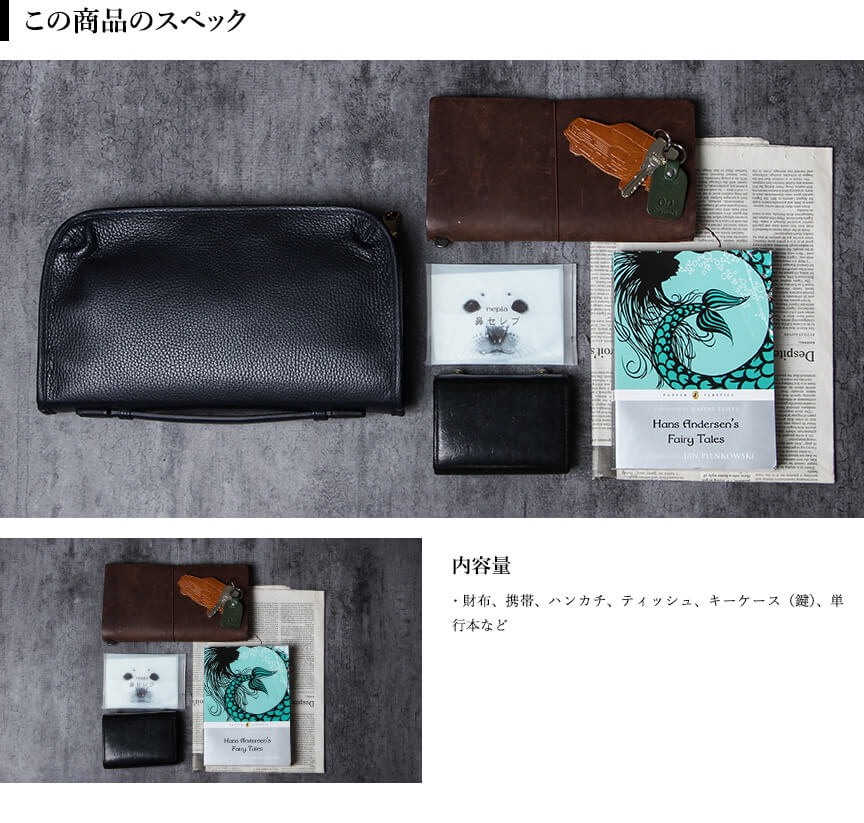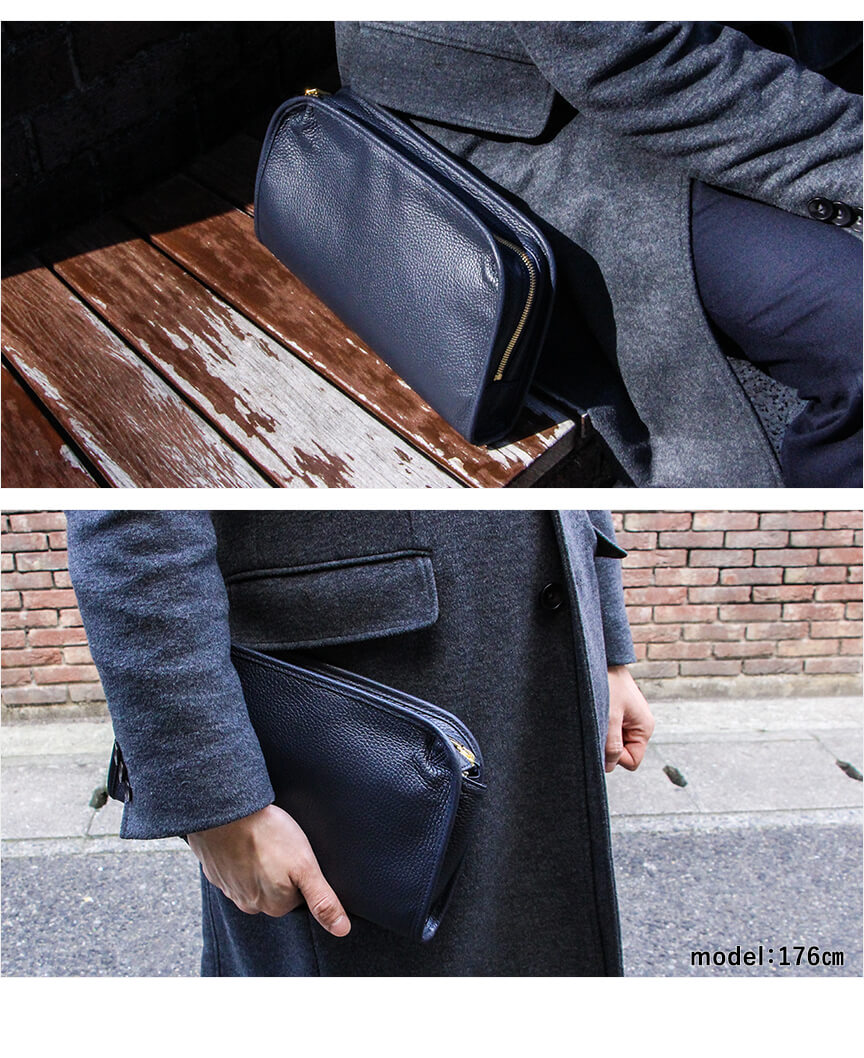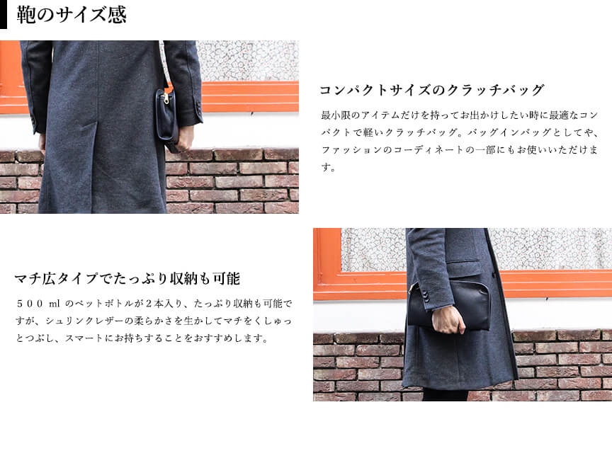 必要最低限の携帯品を入れられるサイズ感のハンドル付きクラッチバッグ。