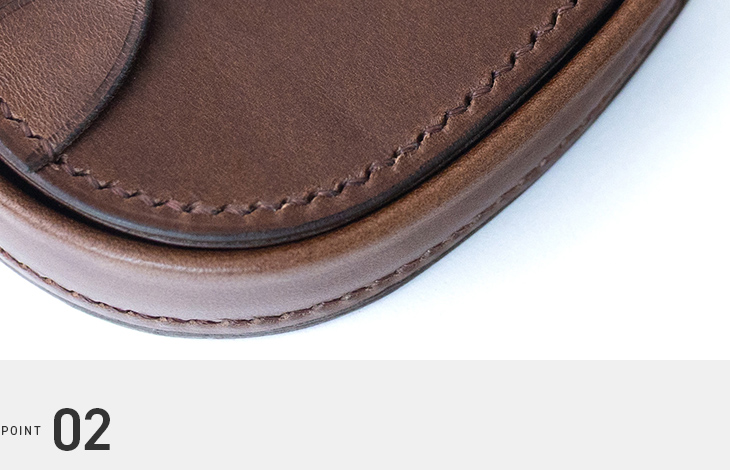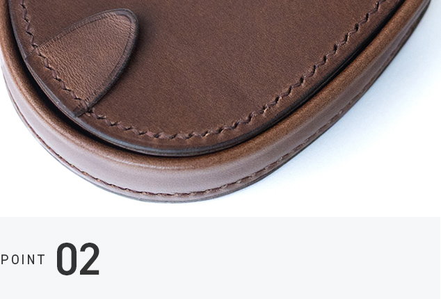 馬蹄型の一番の特徴は、直角に縫い合わされた部分。革を90度に合わせ、手縫いで斜めに縫い付けるこの技術は、ミシンでは決して真似できません。熟練の職人だけが成し得る、量産のできない形状です。