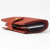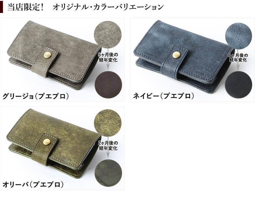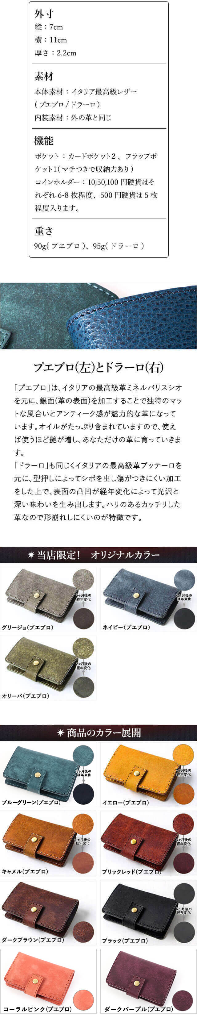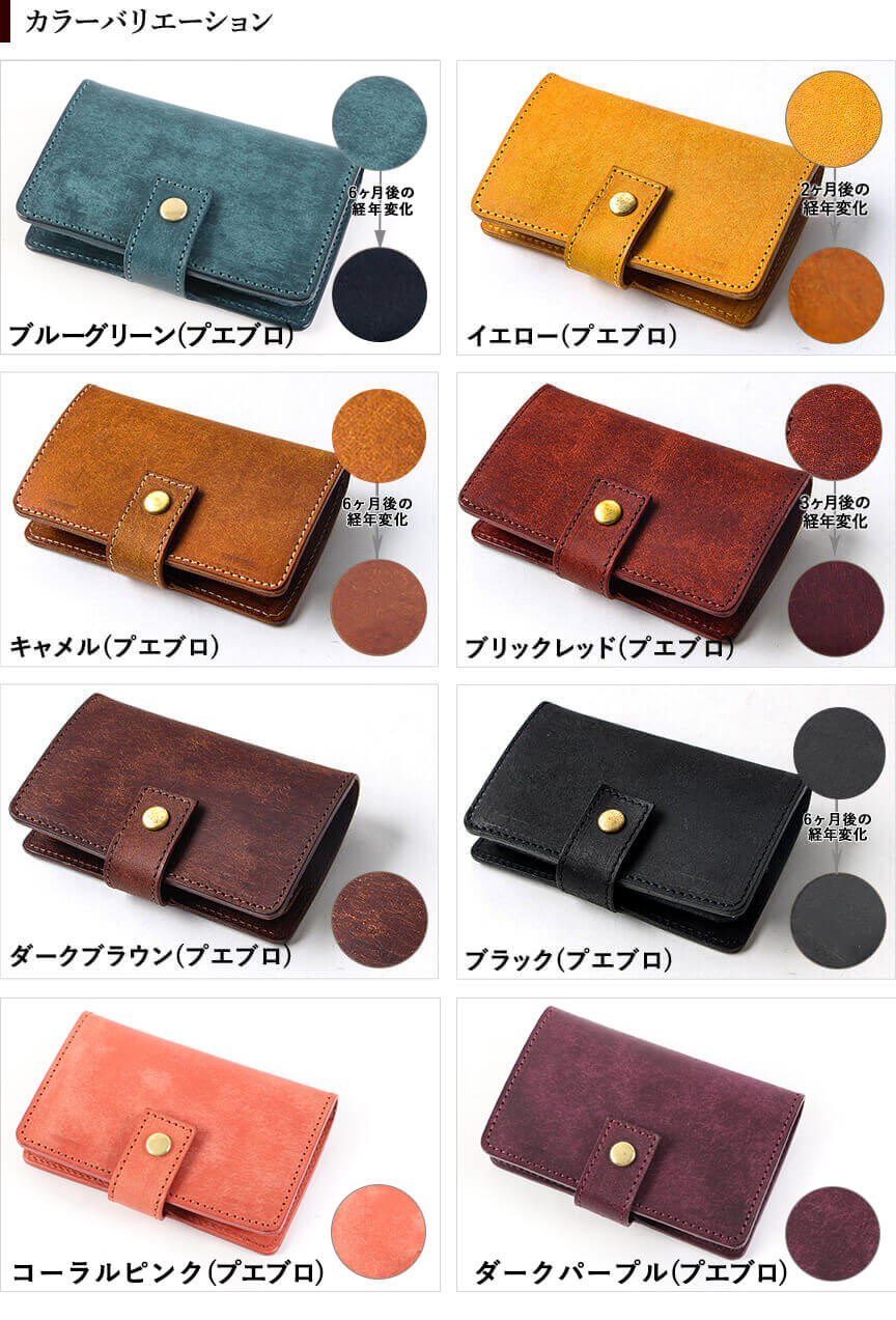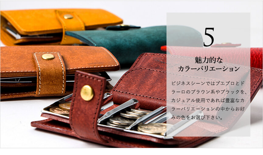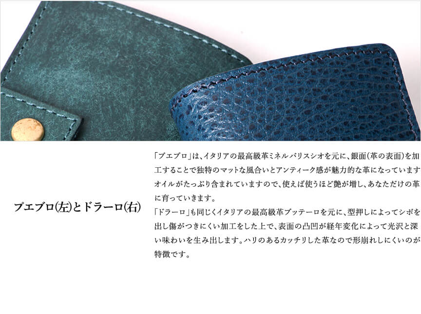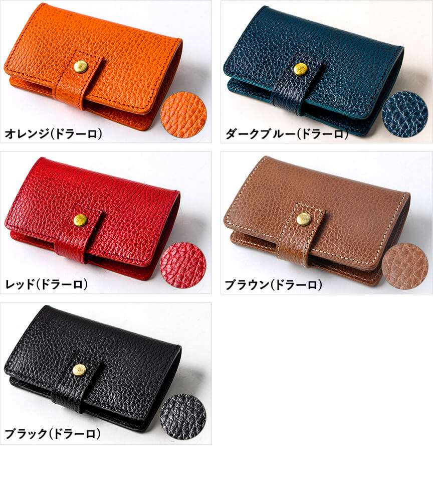 オレンジのドラーロを注文しました。使い勝手は想像していた感じですが、プエブロ革の画像を拝見していたので全体的に色は統一されているのかと思いましたが、ドラーロは表面の色は注文したオレンジ色になっているのですが、内側は染められていない裏革のままで色なしです。加えて金具の接続部分も裏側なので染まっていない色なしを使用しているため、染め忘れのように裏革が丸見えになるのと、ボタンを留めるとコインの金具部分が浮き上がる仕様になっているため、裏革色なし部分に金属の銀色が4つポツポツ丸見えで染め忘れ?と思うような感じで恥ずかしいと思いました。金具の接続部分だけでも表革を使ってくれれば良いのにと思いました。残念です。
