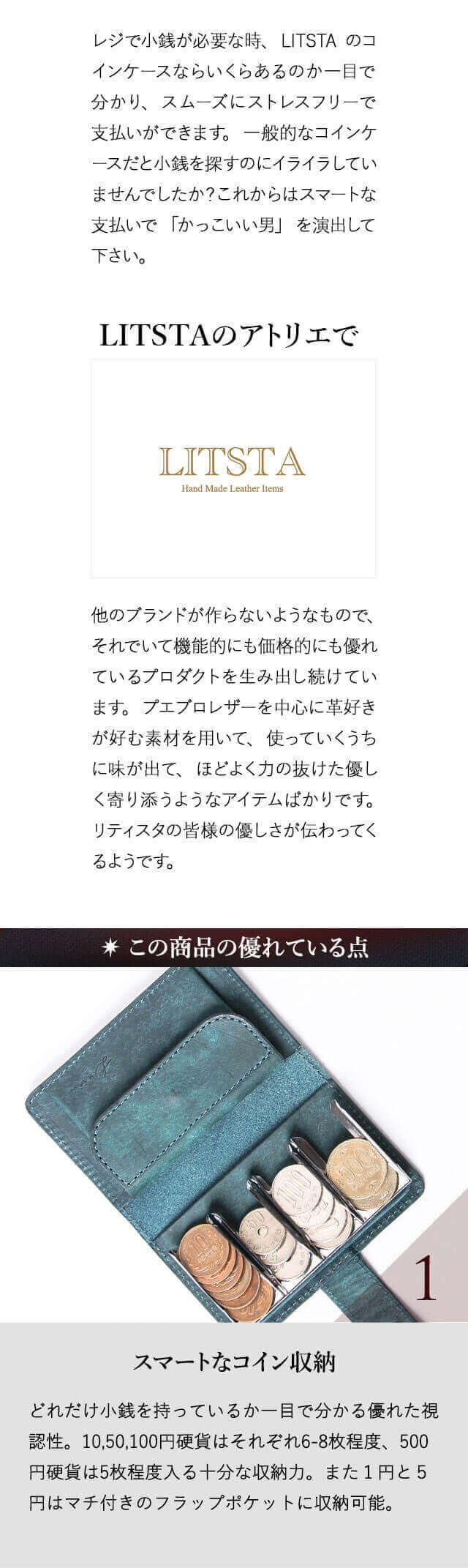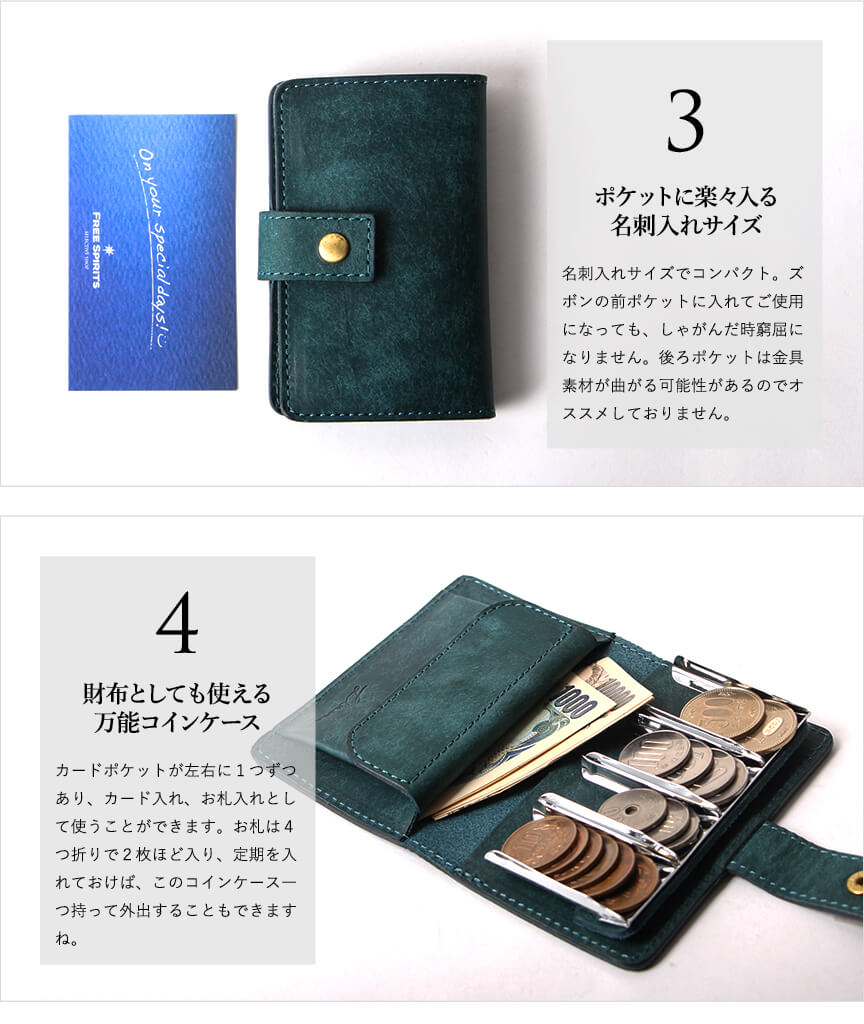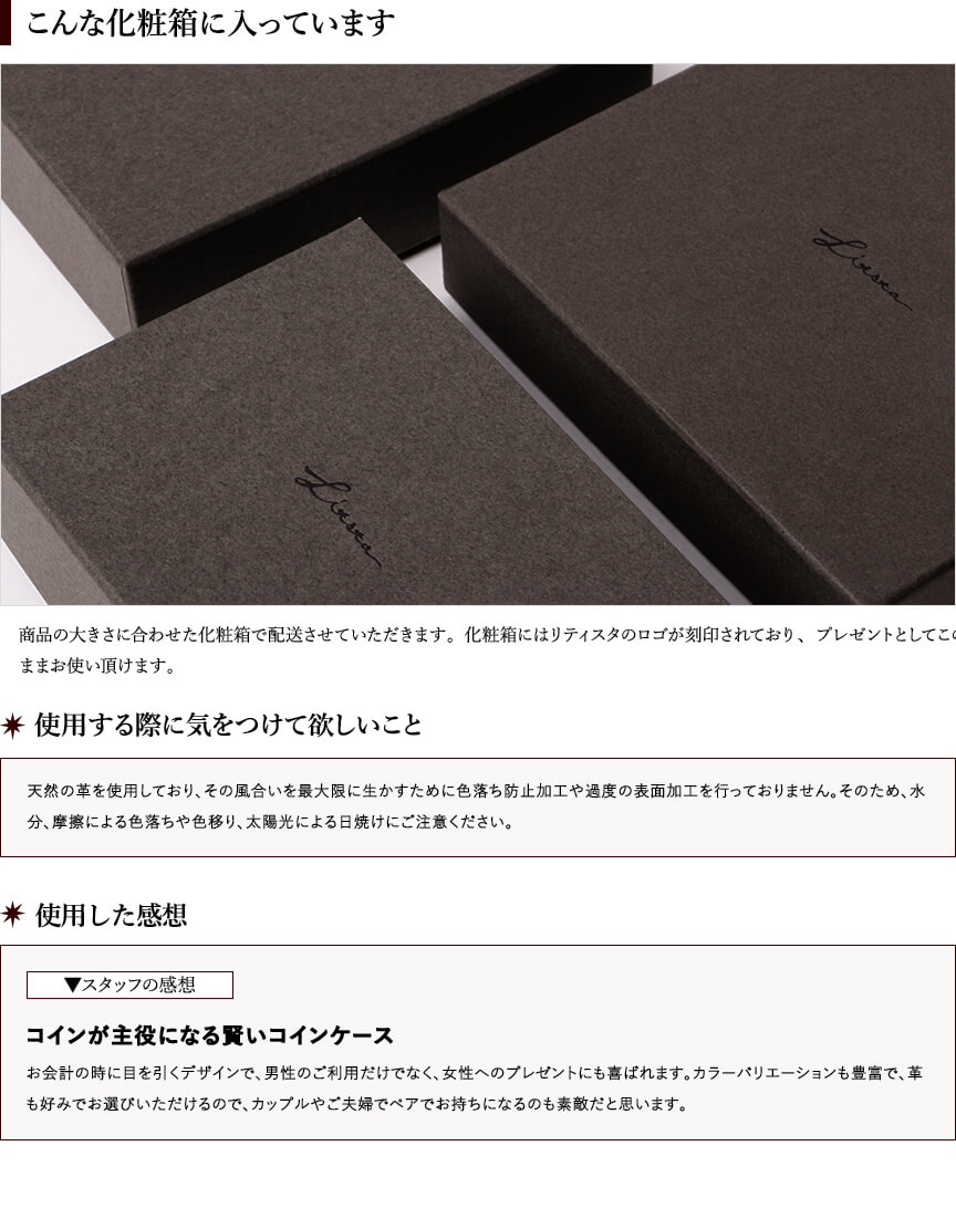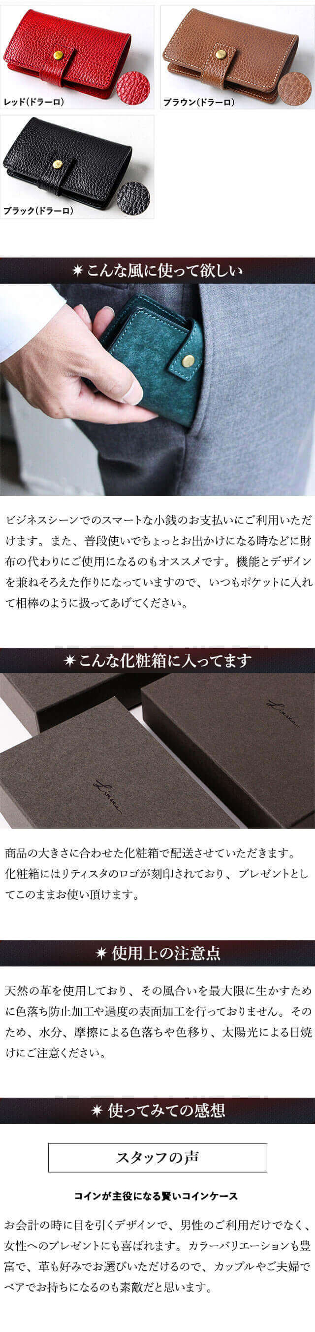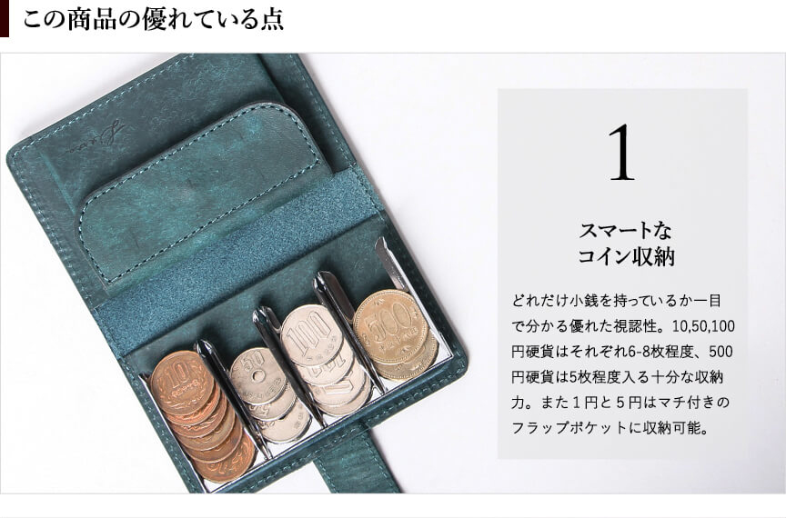友人の誕生日プレゼントと自分用にそれぞれ色違いで購入させていただきました。友人も私も現在、長財布を使用していて小型の小銭入れを探していました。実際使ってみたのですが、この財布は、それぞれの小銭を素早く取り出すことが出来るので、レジでもたつくことが無くなりました。友人もとても喜んでいました。また、この財布は革製品なので、これからの経年変化が楽しみです。