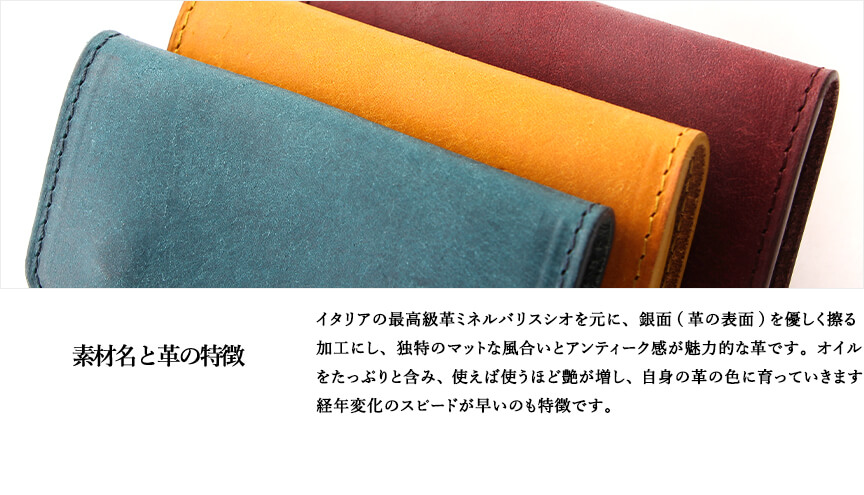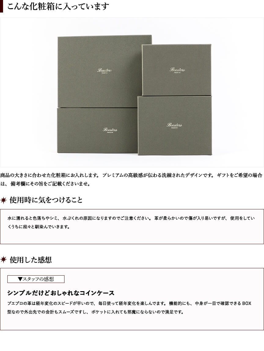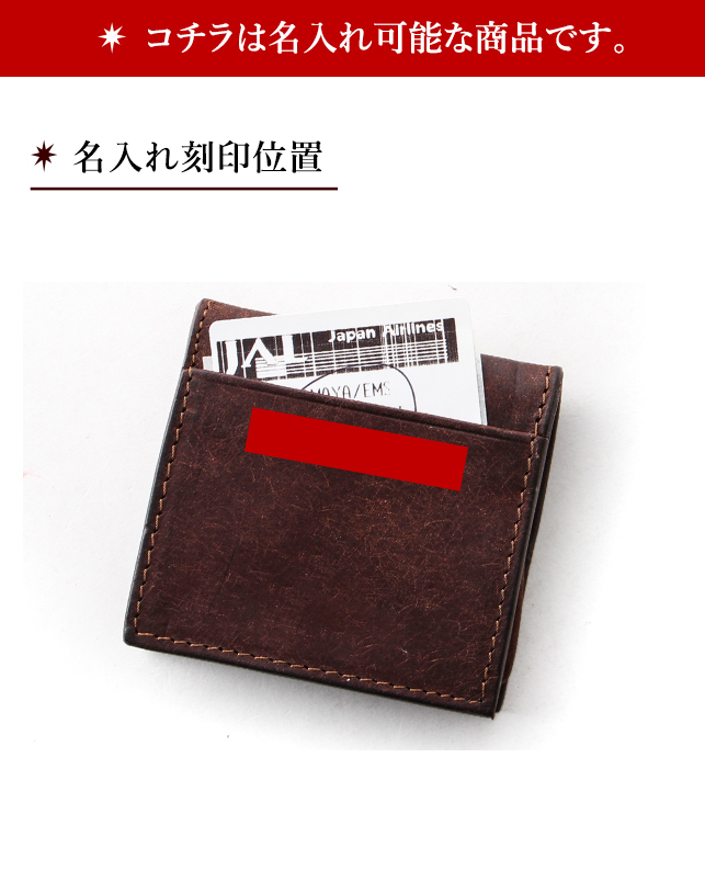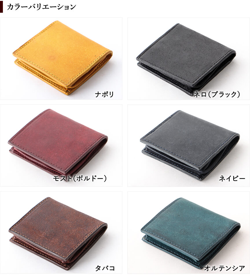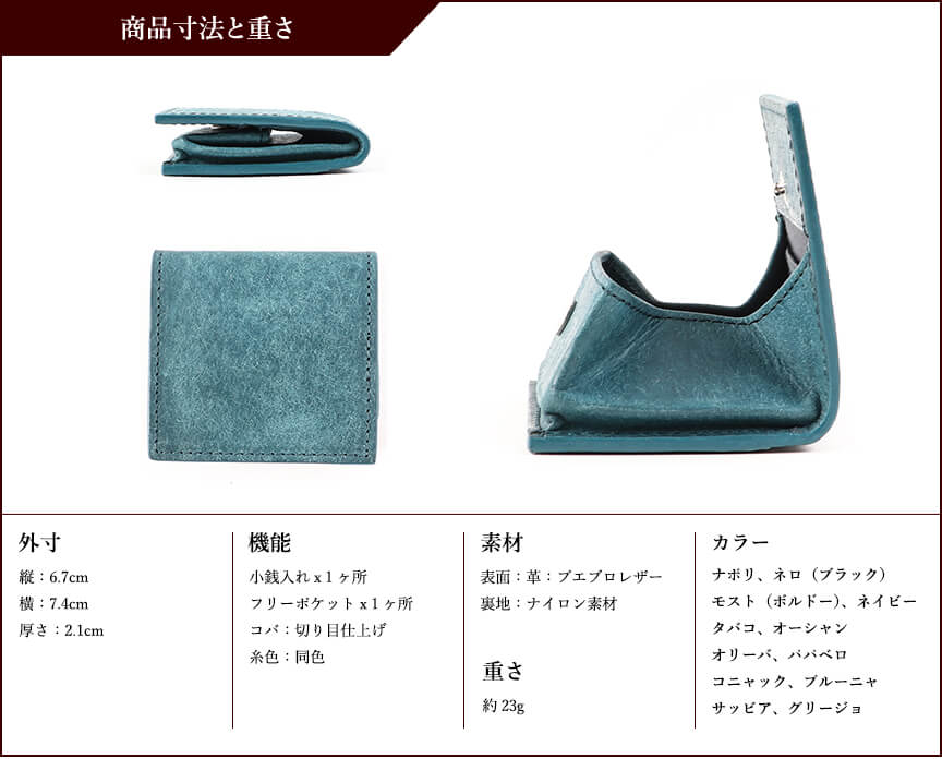 【サイズ】 外寸:縦6.7cm×横7.4cm×厚さ2.1cm 【重さ】 約23g 【素材】 イタリアンレザー:ハバナ、プエブロ、アレス 【生産国】 バングラディッシュ 【仕様】 小銭入れ×1ヶ所 フリーポケット×1ヶ所 コバ:切り目仕上げ 系色:同色