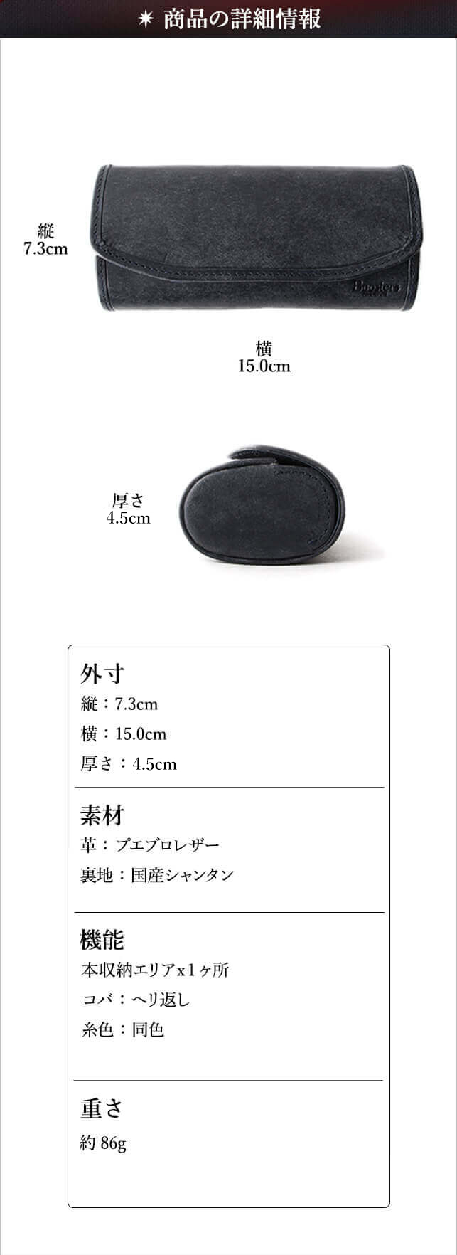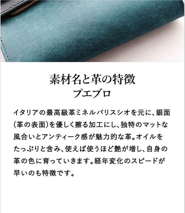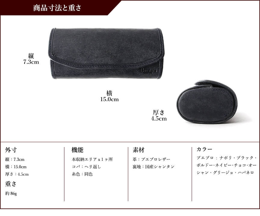 【サイズ】 外寸:縦7.3cm×横15.0cm×厚さ7.5cm 【重さ】 約96g 【素材】 革:プエブロ 【生産国】 バングラディッシュ 【仕様】 本収納エリア×1ヶ所 しおり×1ヶ所 コバ:へり返し 系色:同色