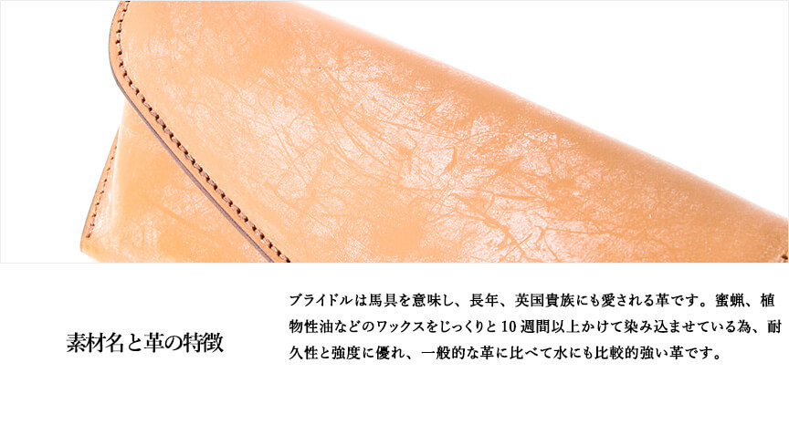革の特長:オイルを含ませた堅牢なヌメ革を使用しています。傷がつきやすいですが、使い込むに従い艶が出て目立たなくなります。