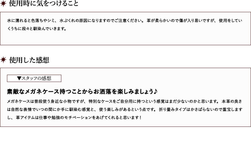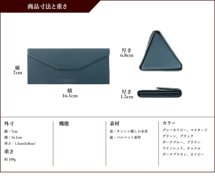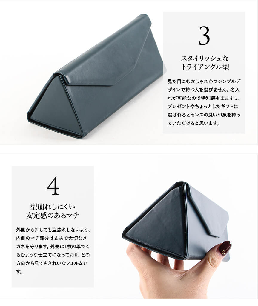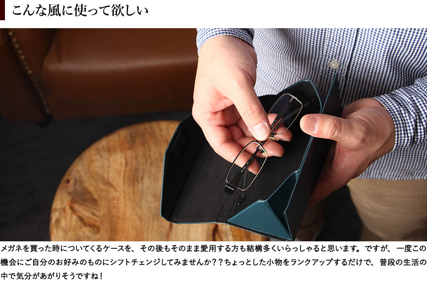 メガネを使っている時にカバンの中で邪魔にならないメガネケースが欲しくて購入しました。 革製品にしては値段がかなり手頃に感じた為この商品を選びました。 実際手にしてみると、メガネ収納時は三角の部分が少しかさ張る印象です。しかし、折り畳んだ時のコンパクトさと、シックな色合いは求めていたとおりで気に入りました。