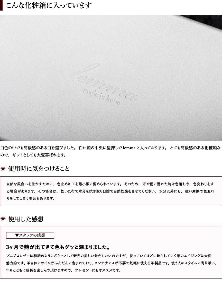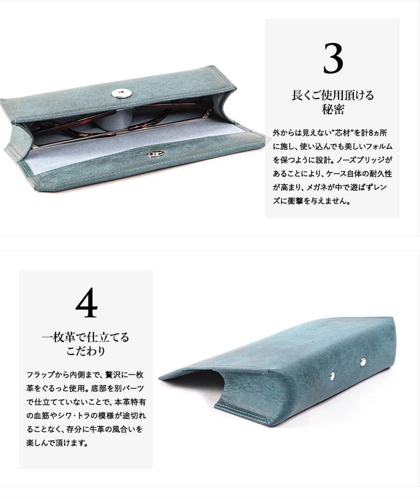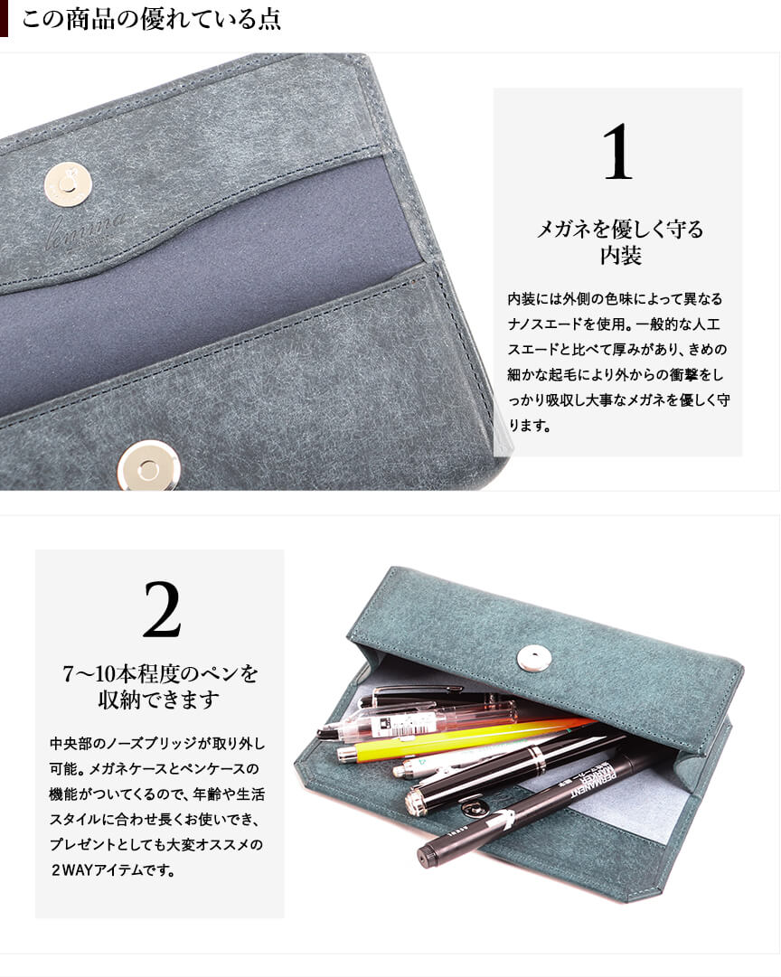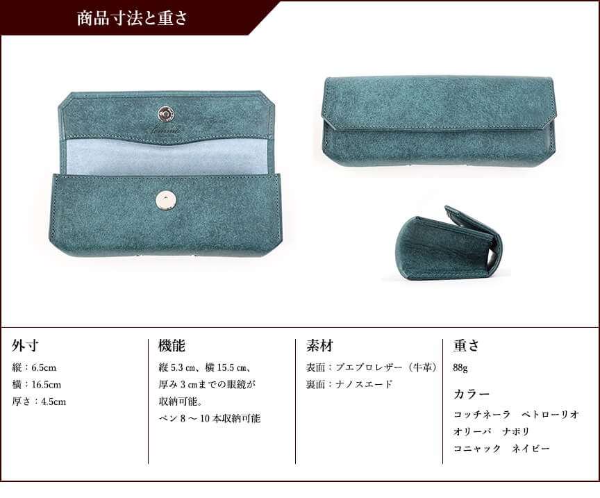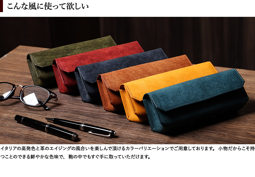 メガネケースとして使用しています。出し入れする際、最初は間口が硬い印象でしたが、段々と馴染んで柔らかくなり、使い勝手が良くなってきました。また,ハードケースではないため強度が気になっていましたが,丁寧な作りでメガネをしっかりと保護してくれています。