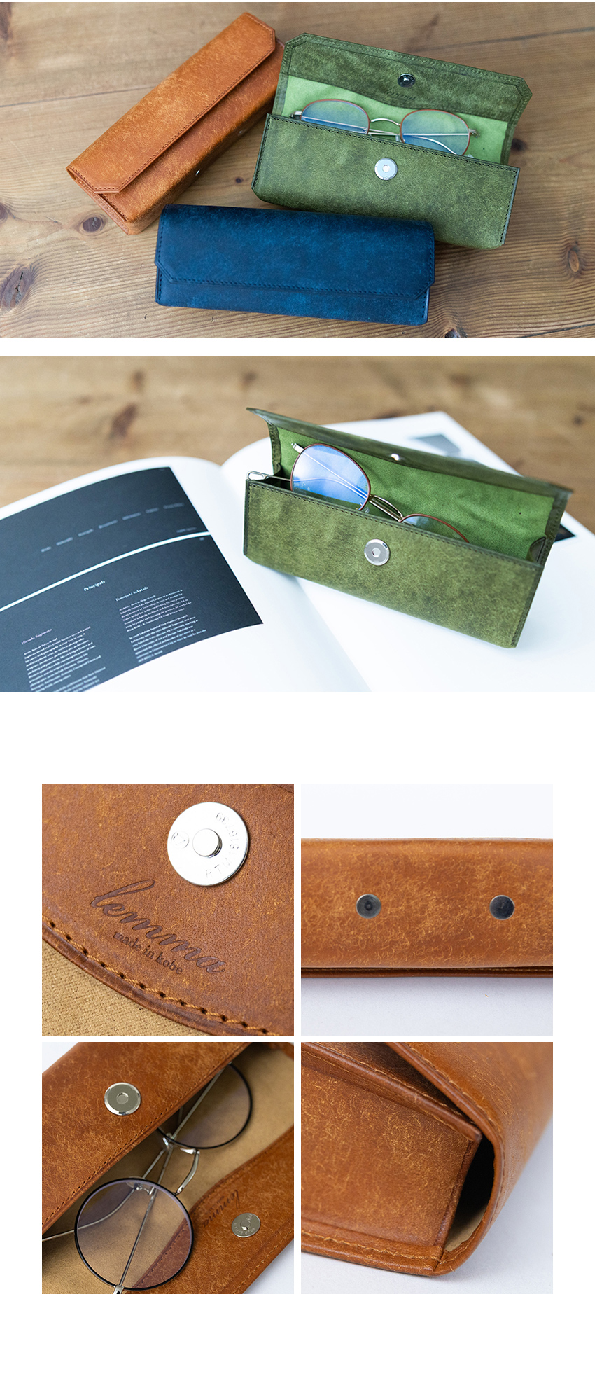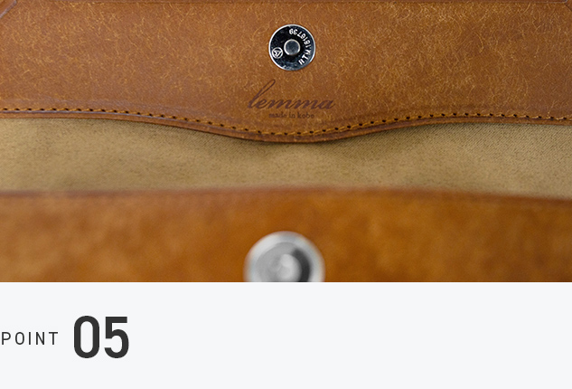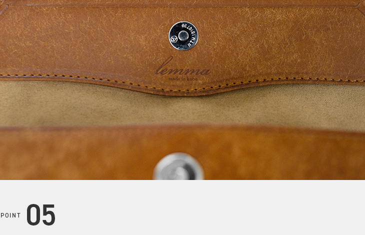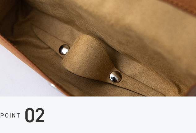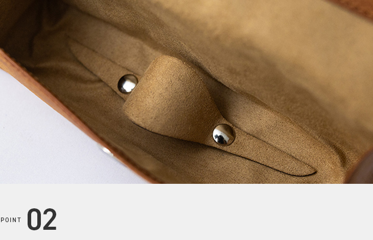 革の張りに負けない高強度のマグネットを採用。磁力で自然に留まるため過度な負担をかけず、ペンやメガネを傷つけません。留め具を外側に出さないことで、革の存在感と美しさを際立たせています。