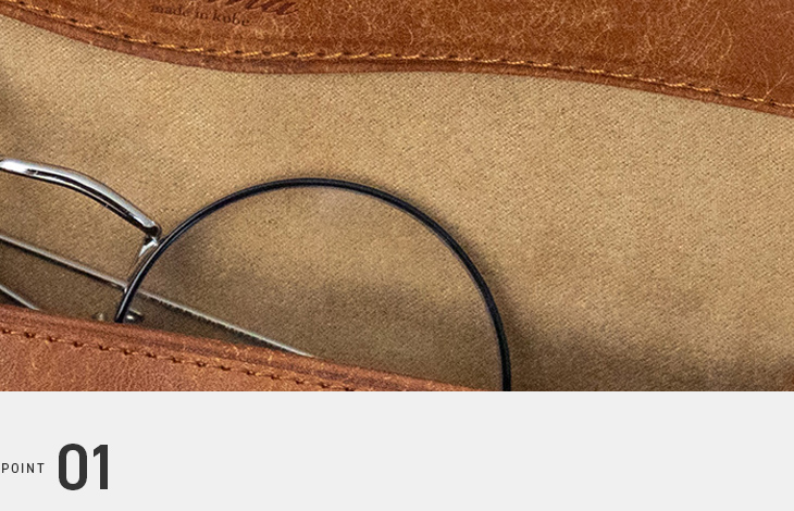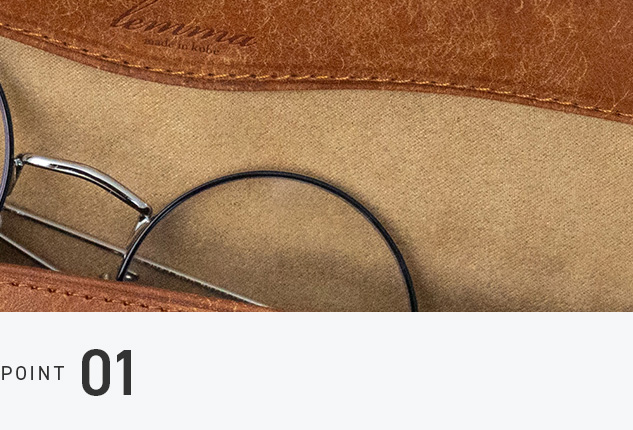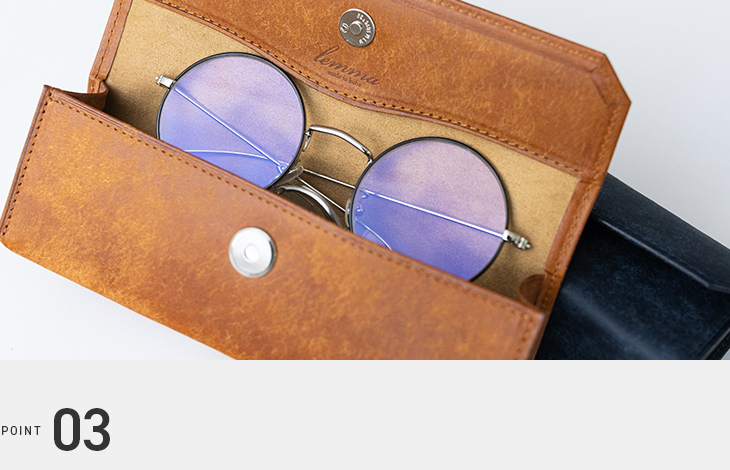 内装には外側の色合いに合わせたナノスエードを採用。一般的な人工スエードよりも厚みがあり、きめ細かな起毛によって外部からの衝撃をしっかり吸収し、大切なメガネをやさしく守ります。
