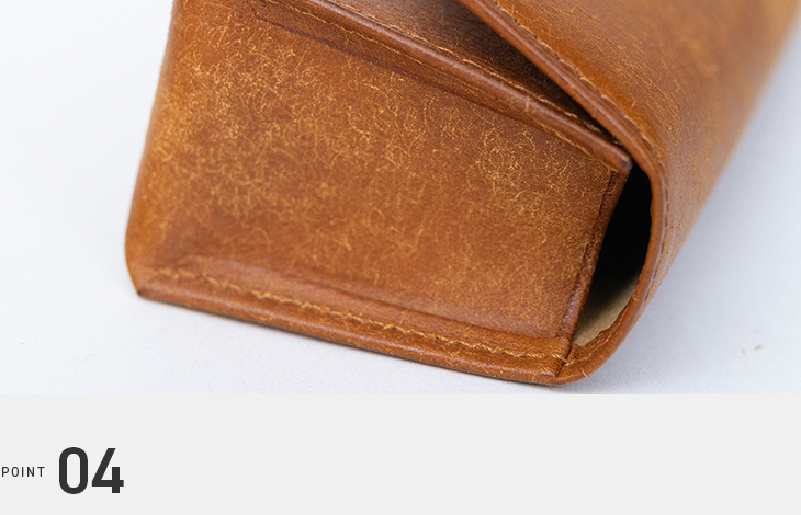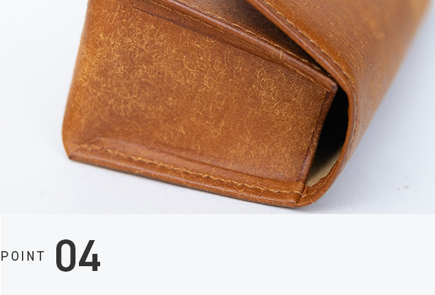 フラップから内側まで贅沢に一枚革をぐるりと使用。底部を別パーツで仕立てていないため、本革特有の血筋やシワ、トラ模様が途切れることなく、牛革ならではの風合いを存分に楽しんでいただけます。