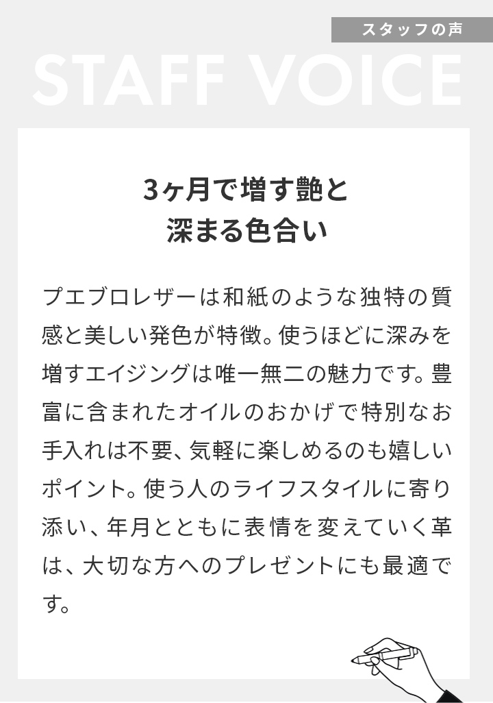 銀面(革の表面)を優しく擦り、あえて毛を逆立ててアンティーク調に仕上げたプエブロレザー。他の革よりも格段に経年変化を楽しんでいただけます。表面を擦る処理がされているため、通常よりも手の汗や脂、陽の光などの吸収が早く、傷なども目立ちにくいのが特徴です。