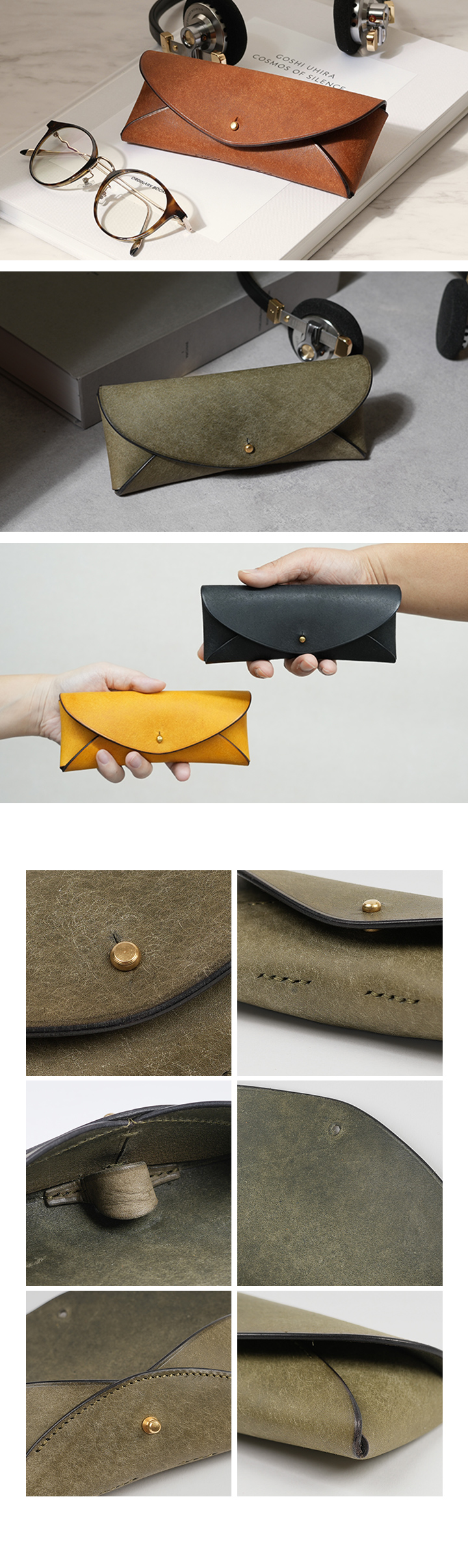 一枚の革を静かに折り上げて生まれた“yoko”は、眼鏡を包む小さな部屋のようです。丸みを帯びた優しい輪郭が手になじみ、真鍮の金具はレンズに触れない設計で大切な相棒をそっと守ります。内側の仕掛けが揺れを抑え、日々の暮らしにやさしく溶け込む。その経年は静かに深まり、使うほどに自分だけの表情を宿します。