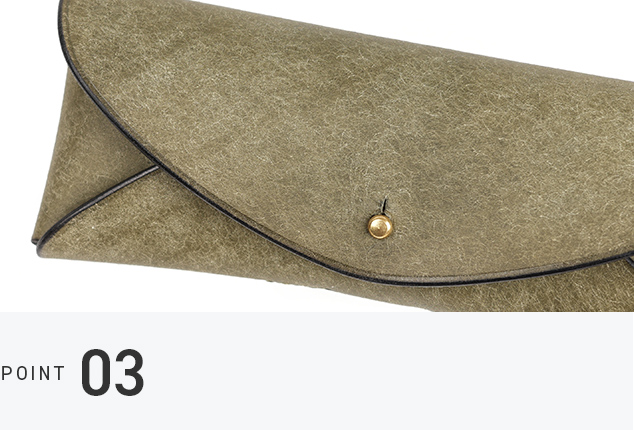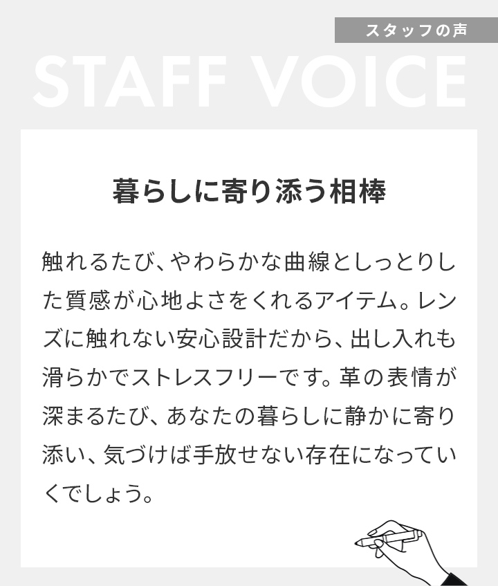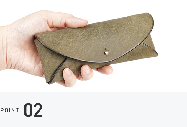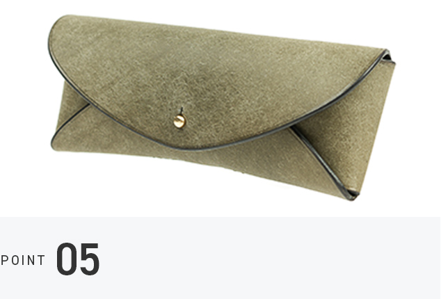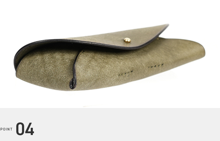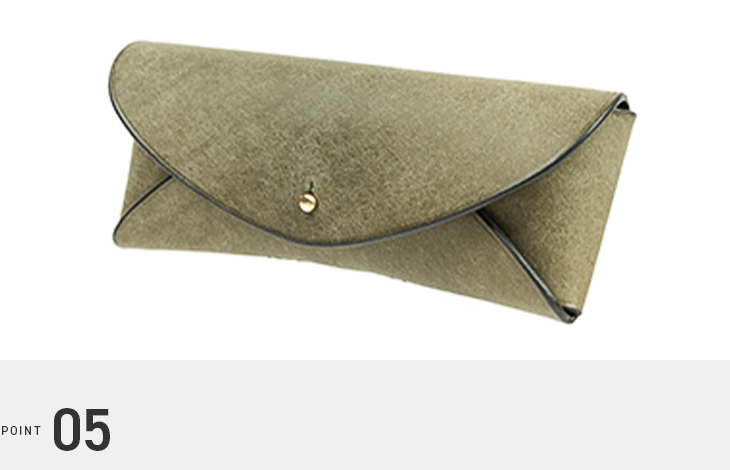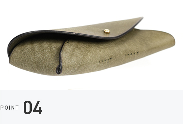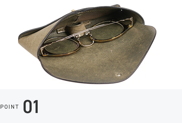 真鍮の留め具がレンズに触れないつくりで、眼鏡を傷から守ります。内側には鼻当てのようなパーツがあり、ケースの中で揺れを抑える安心の仕組み。日々に溶け込む、落ち着いた使い心地が特徴です。