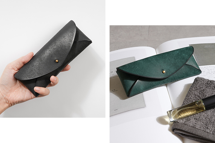 “yoko”は、一枚革を折り上げて生まれる柔らかな立体構造が特徴の眼鏡ケースです。丸みのあるシルエットは手にそっと沿い、鞄にも収まりやすい落ち着いたサイズ感。日常使いの道具でありながら、革の表情が静かに深まり、使うほど風合いが育つ楽しみがあります。暮らしの風景に自然と馴染む、上質で控えめな存在です。