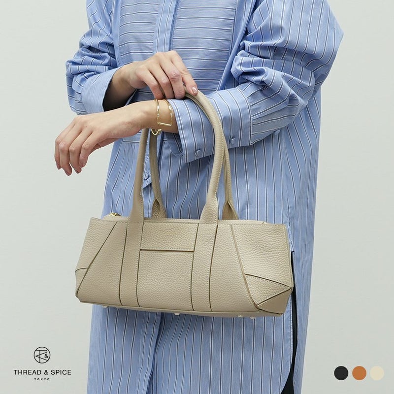 「THREAD&SPICE」は、材料をつくる人や職人、お客様など、人と人との繋がりを大切にするブランドです。バッグの多面体デザインも、人との繋がりを象徴しています。シュリンクレザーを採用しているため、傷が目立ちにくく、カジュアルなシーンでも気軽に使えます。