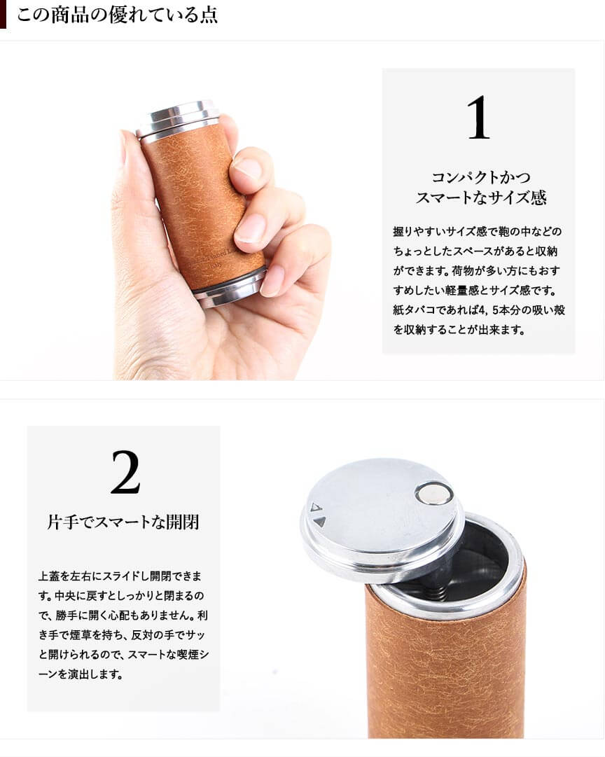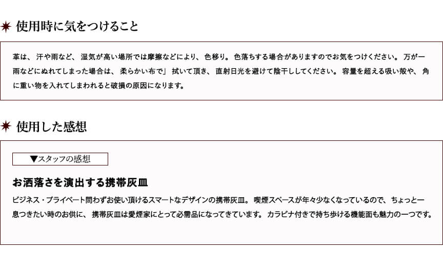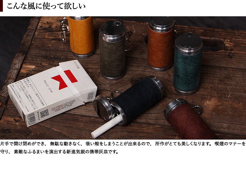 今回、プエブロのツイスト携帯灰皿を購入させていただいた者です。いい商品をありがとうございます。商品の箱を開けた瞬間、革の色合いが好みで気に入りました。これから使っていくうちの経年変化も今から楽しみです。商品の大きさも説明文の通りコンパクトで使いやすいサイズだと思います。