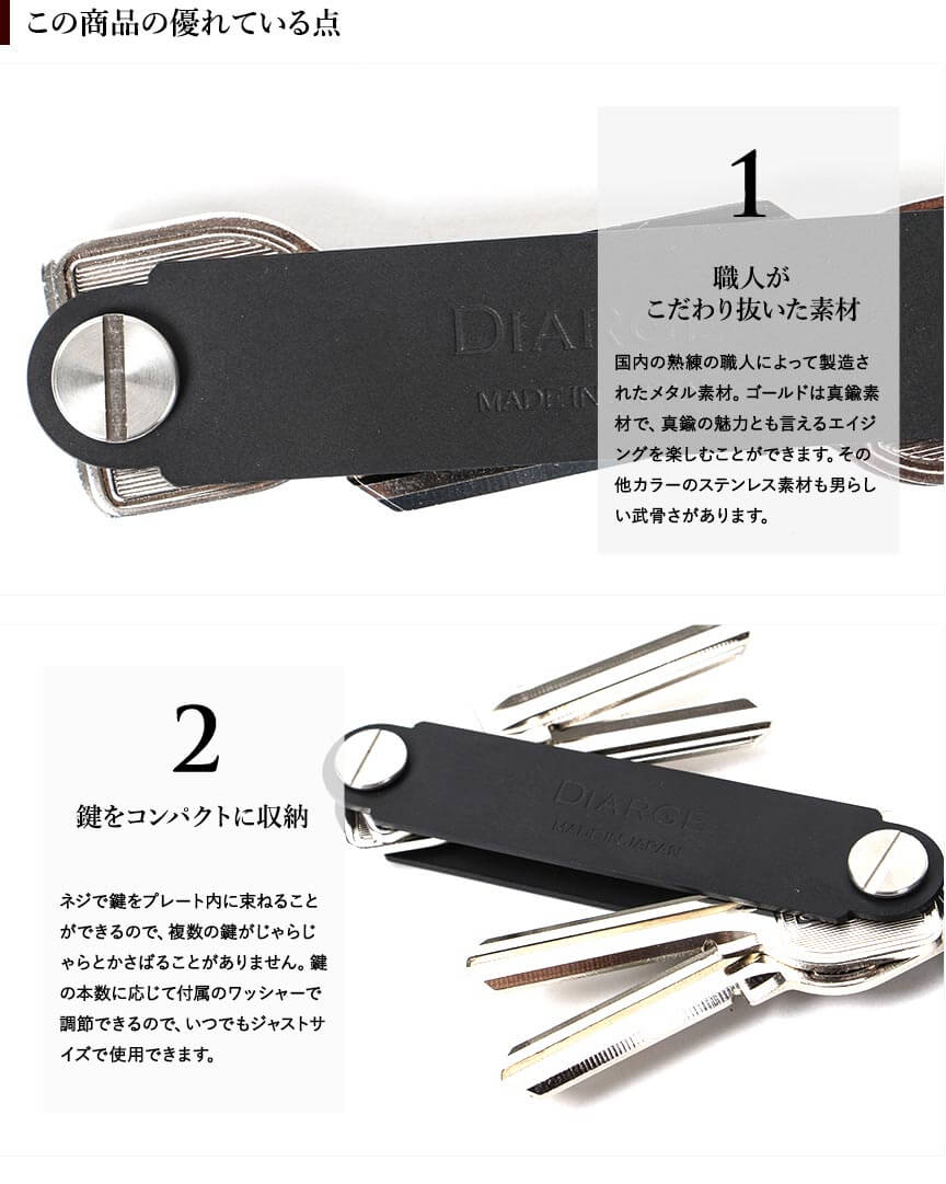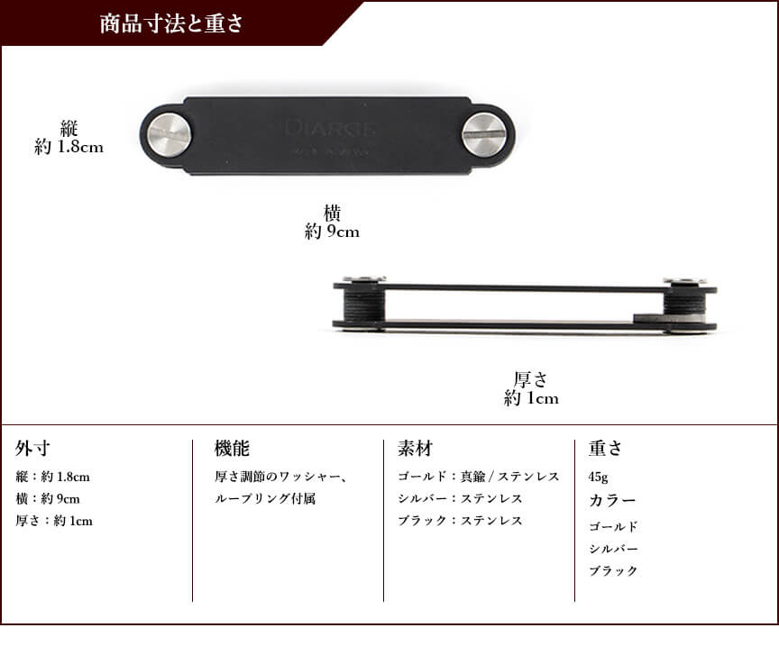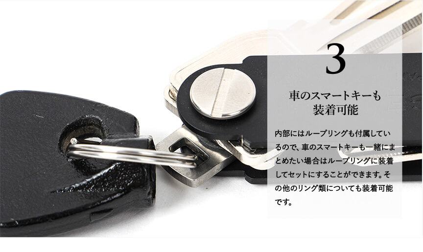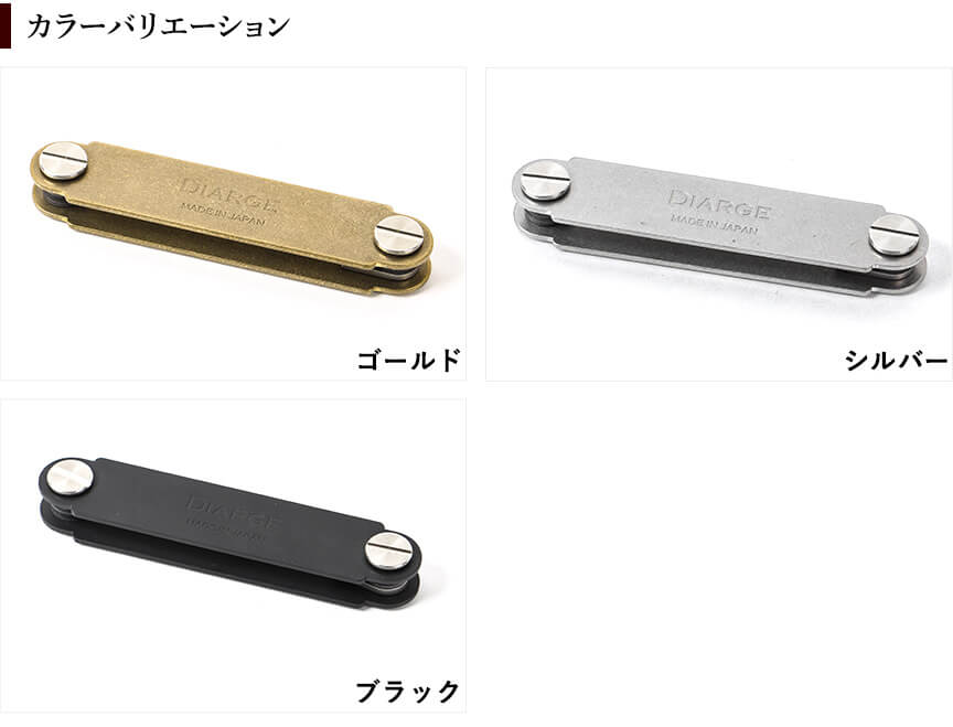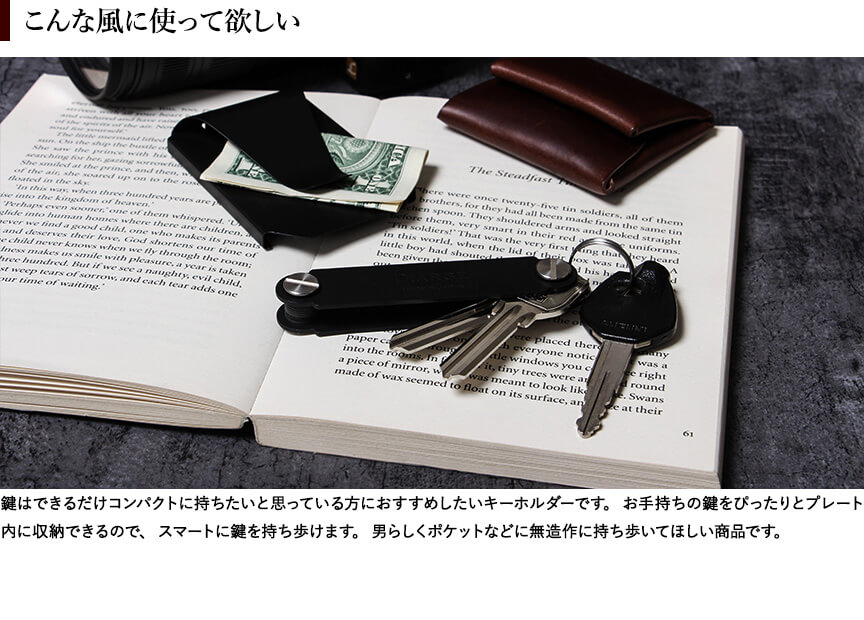 複数のカギを本体の金属プレートに束ねて収納できるマルチキーオーガナイザー。ビスを鍵穴に通しカギを固定するため、必要最低限の容積に鍵を収め、ジャラジャラと音が立たず、ポケットやバッグの中でかさばることもなく、スマートに持ち歩くことができます。