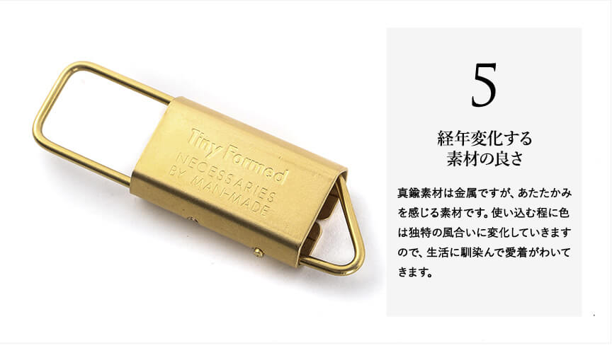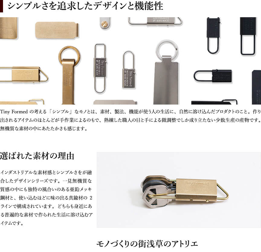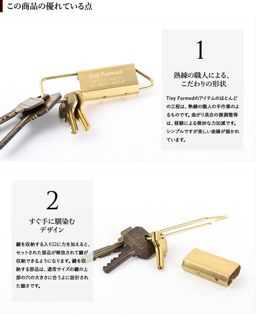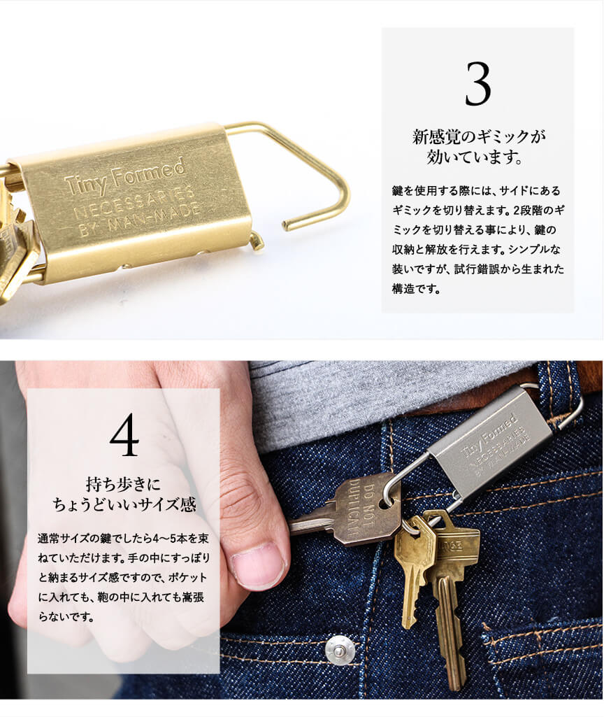 Tiny Formedの基本コンセプトであるシンプルなデザインはそのままに、収納性を追求したKey Fold。4~5本の鍵を束ねて収納できる仕組みになっています。