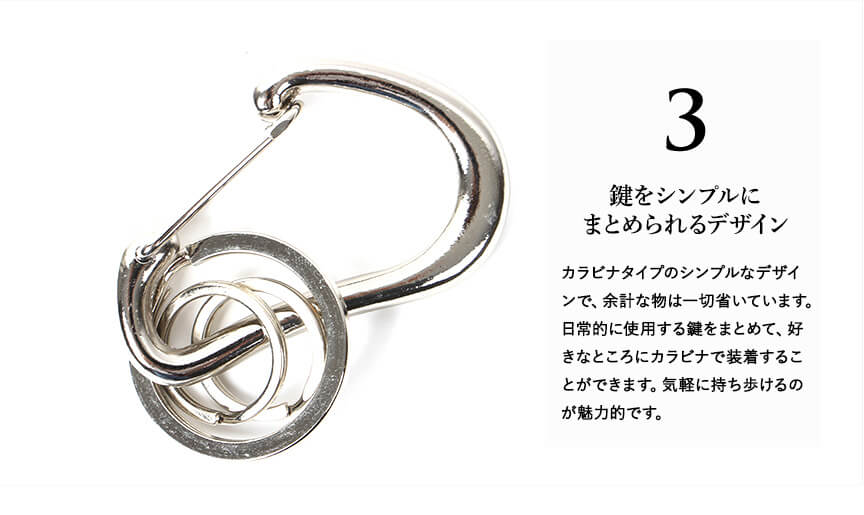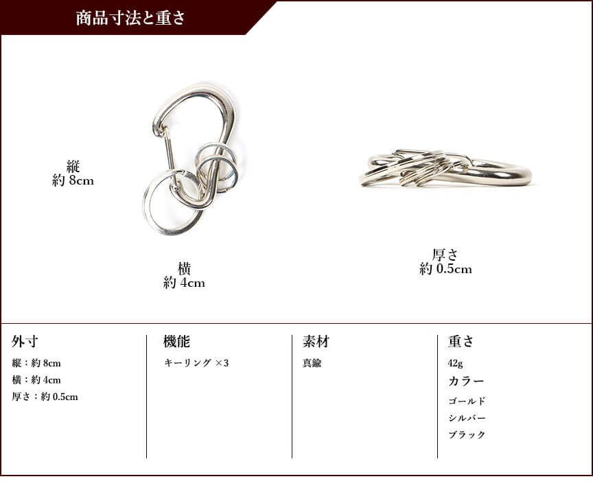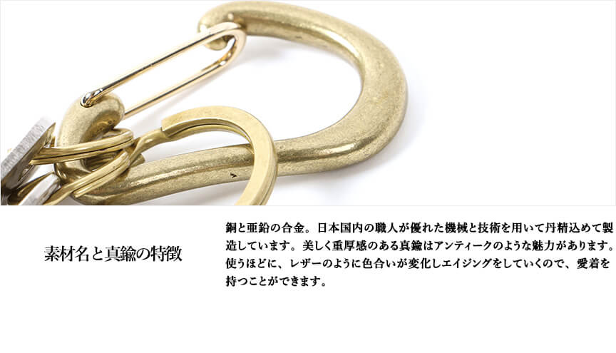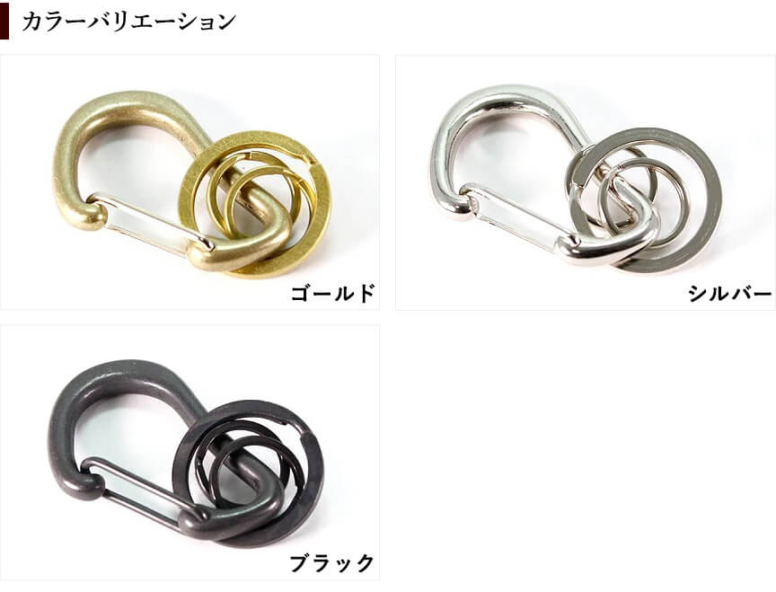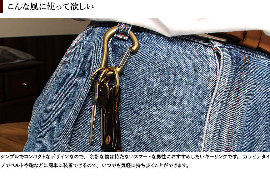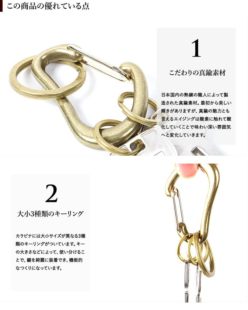 真鍮製カラビナに大小合わせて3つのキーリングを組み合わせたキーリング。