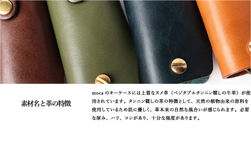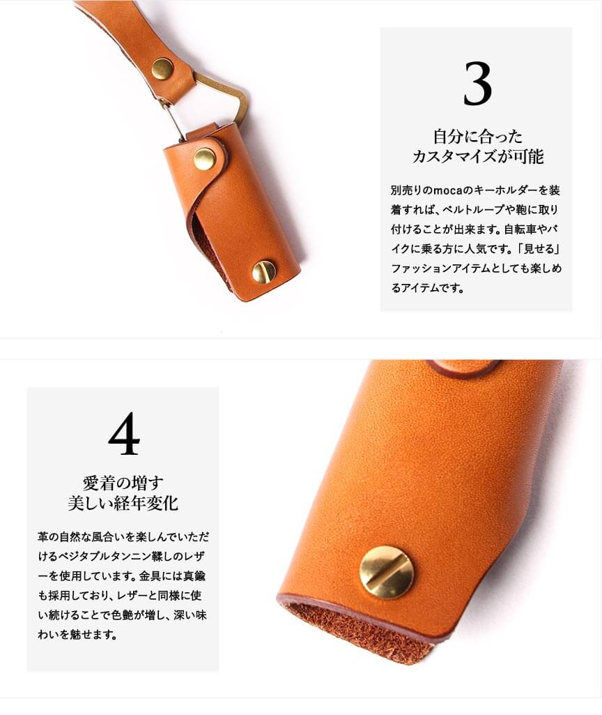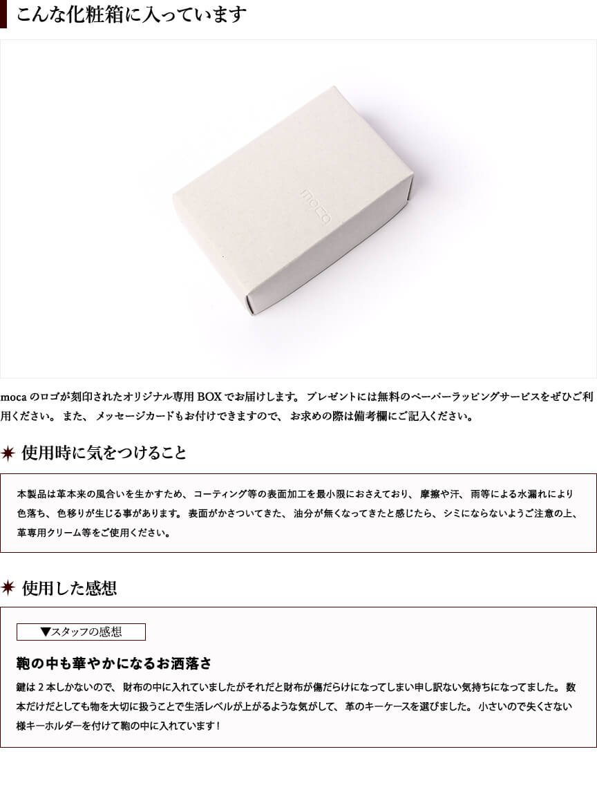 バックにカラビナを付けてそこの浅いポケットにも収納できるキ-ケ-スを探していましたが、mocaをYouTubeで見て即買いしました。質感も取り付けてある金具も文句なしのものでした。カラビナは、clifeの皮付をもっていましたので(ネイビー色)付けた所、お揃いではと思えるほど。購入して大満足です。
