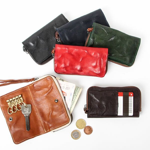 スナップボタンを開けて開くと、鍵用のフックが4個。 フリンジが付いたラウンドファスナーには、 コインやカードが入れられるマチ付ポケット。 サイズさえ合えば、キーレスの車のカギの収納も可能です。 背面にはカード1枚がジャストフィットで入れられるポケットを配しております。