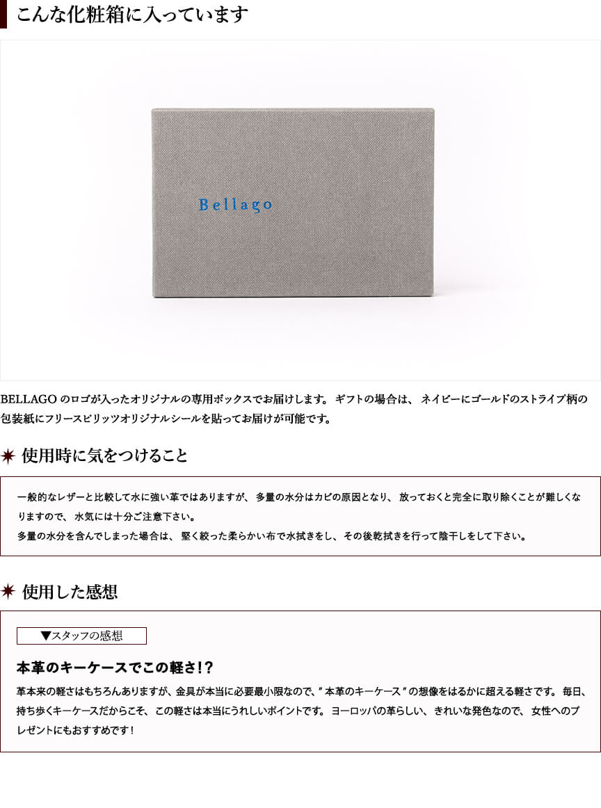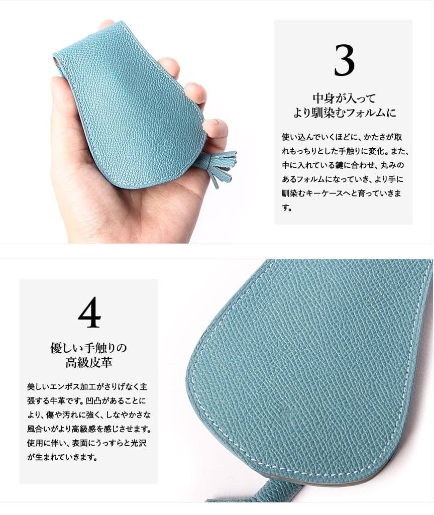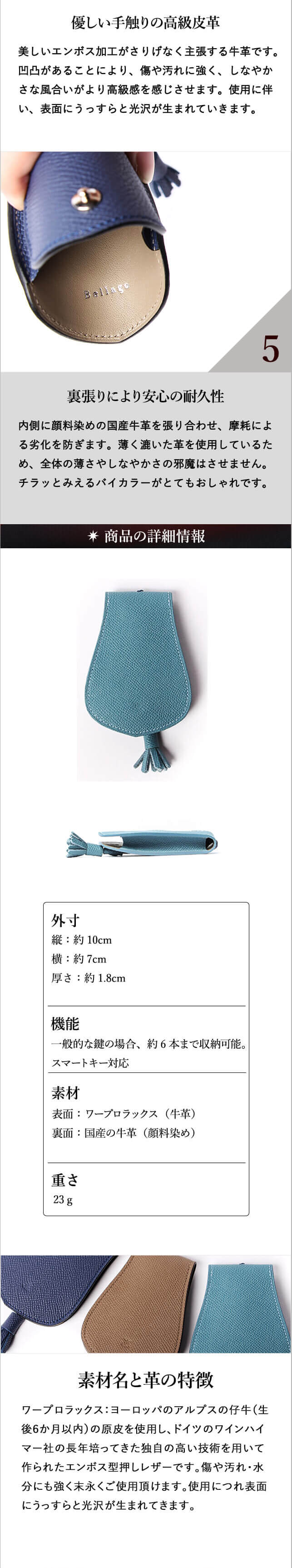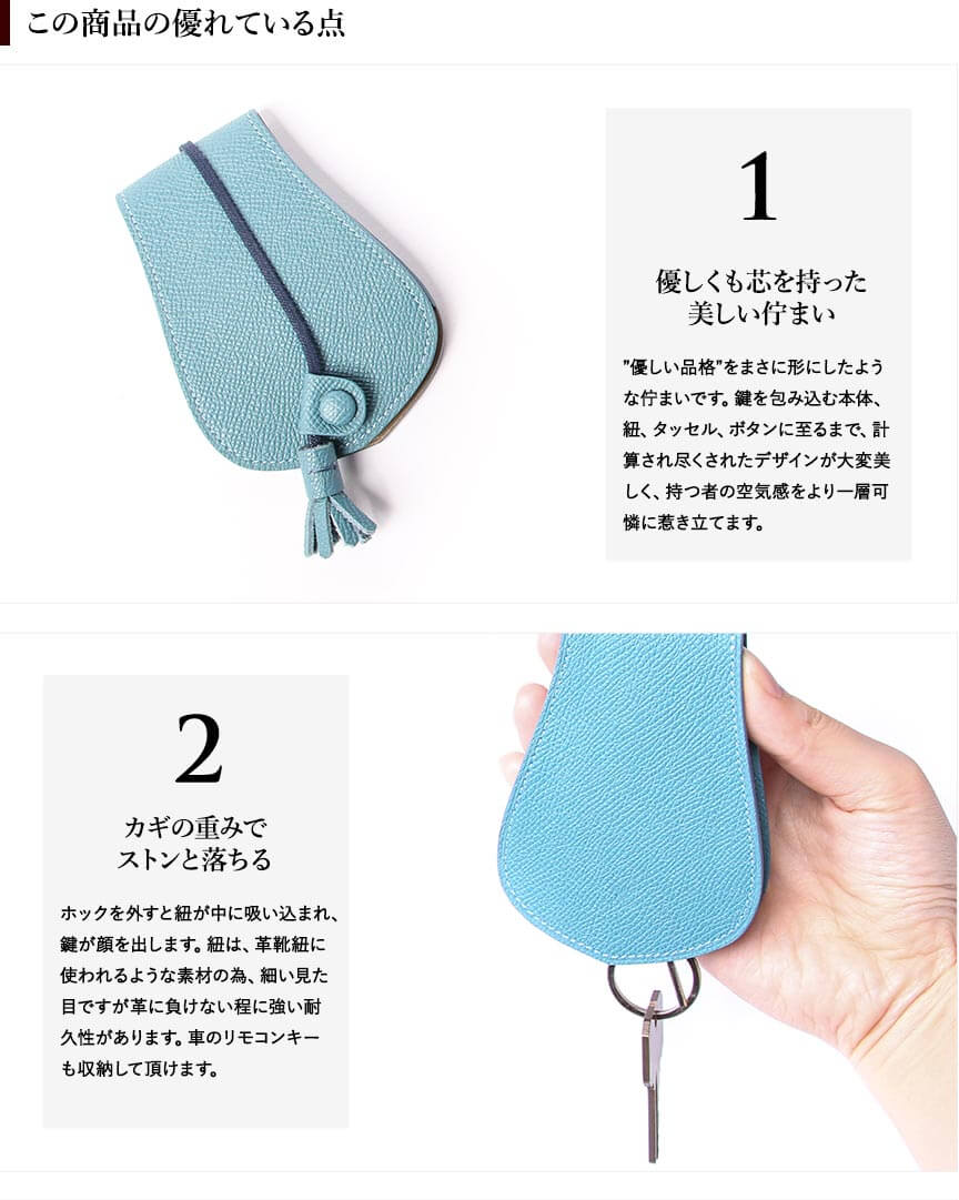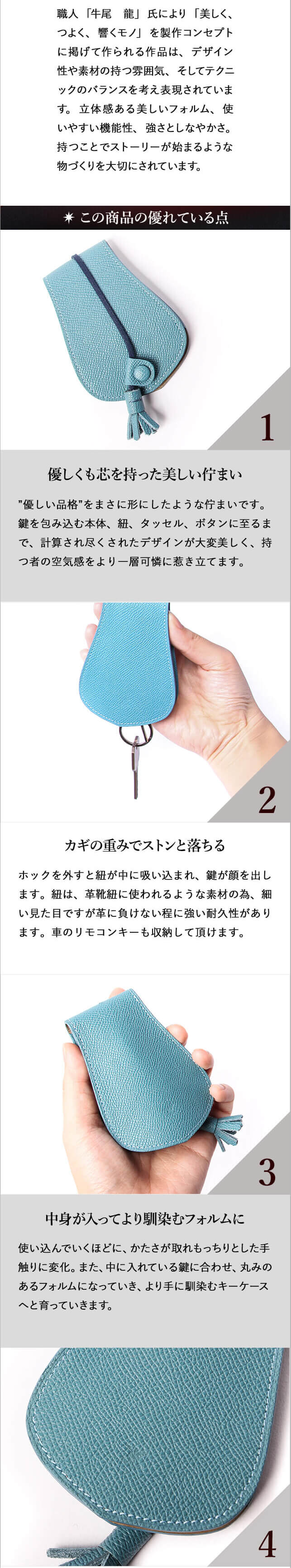 今まで使っていた、ゴールドファイルの薄型のキーケースが今にも壊れそうだったので購入しました。 探し求めていた薄型であることに加え、デザインもしゃれており、革の質感や色合い(インクブルー)、そして丹念な造り、と、どれをとっても高級感があり、とても気に入っています。