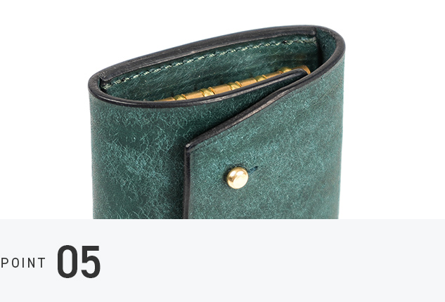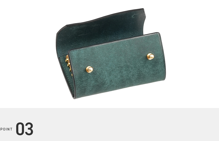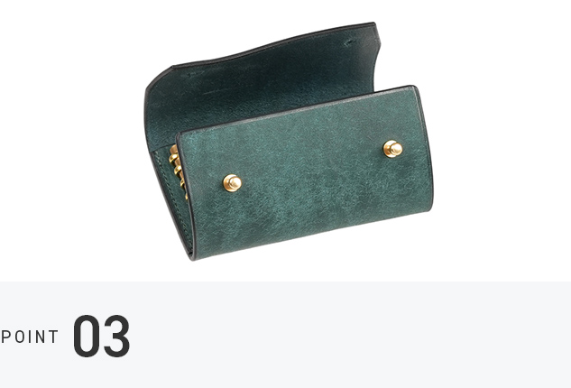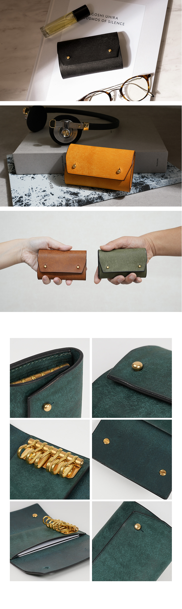 1枚の革で包み込むという何とも贅沢なデザインです。ボタンではなくギボシを使うことでアクセントになり、他にはないキーケースです。開け閉めするたびにギボシで留めるという所作が心地よくクセになります。