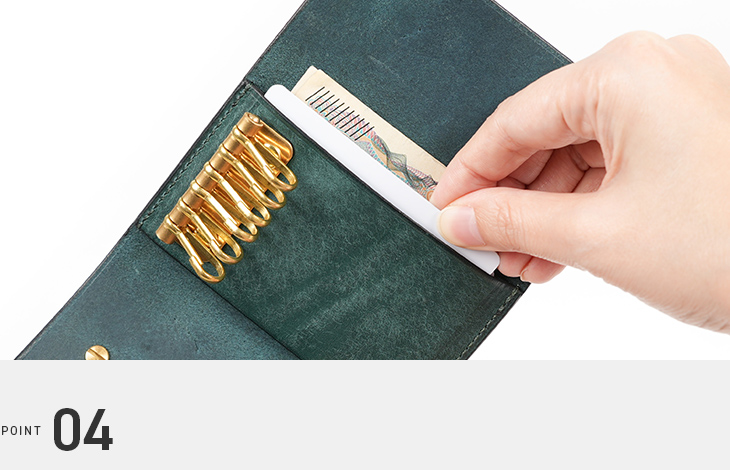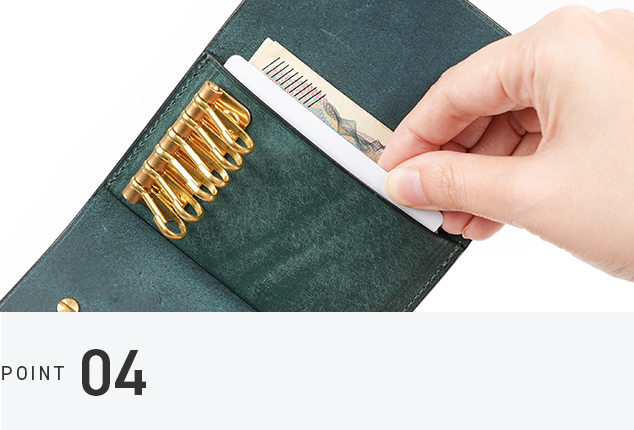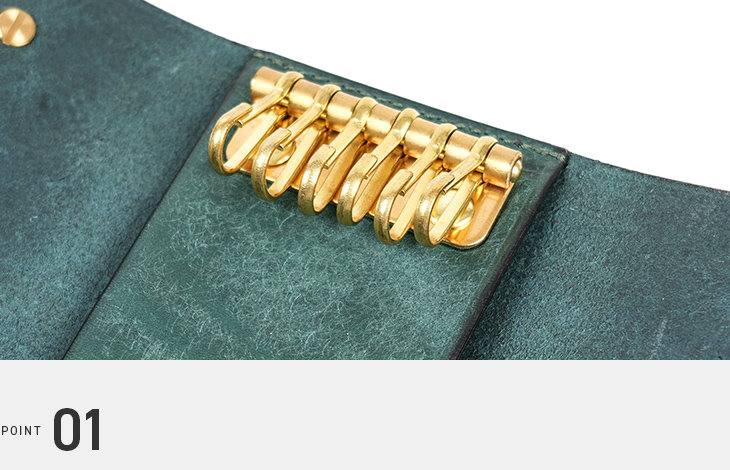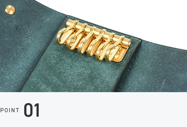 らんぱんのキーケースは、今ではめずらしい6連タイプ。鍵が少ない方は、お気に入りのキーホルダーを付けてアレンジできます。鍵は上から押すだけで簡単にセットできるので、ノンストレスでお使いいただけます。