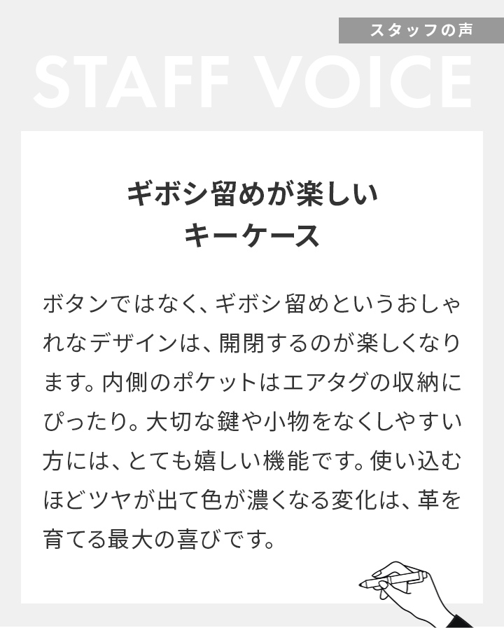 「使う人が主役になるように」という考えから、らんぱんの製品はあえてブランドロゴを入れず、革が育っていく個性を楽しんでほしいというコンセプトです。そのためシンプルなデザインですが、ギボシがアクセントになり、革の経年変化を最大限に楽しませてくれます。使うたびに、使っている自分を好きになる、そんなキーケースです。
