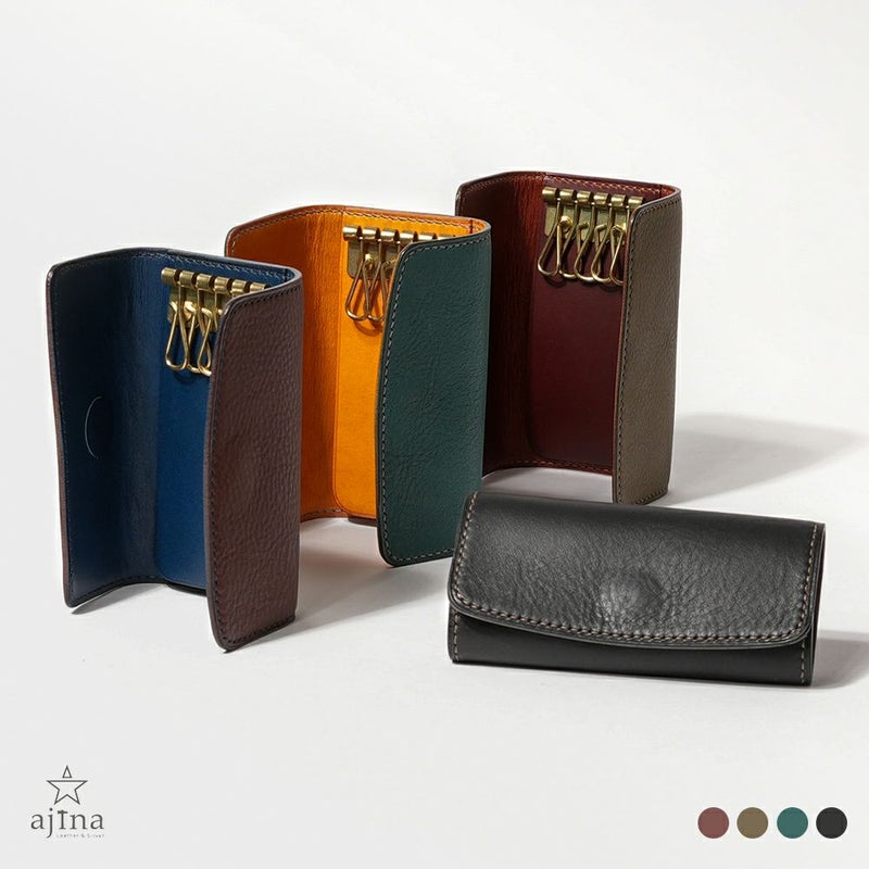 手のひらサイズの王道デザインながら、外装と内装で革を変えているからこその魅力あるキーケースです。カラーもバイカラーになっており、外装のミネルバボックスと内装のブッテーロで、質感の違いや経年変化の違いを存分に楽しんでいただけます。カラーごとにステッチの色も異なり、すべて手縫いで製作されているこだわりある逸品です。