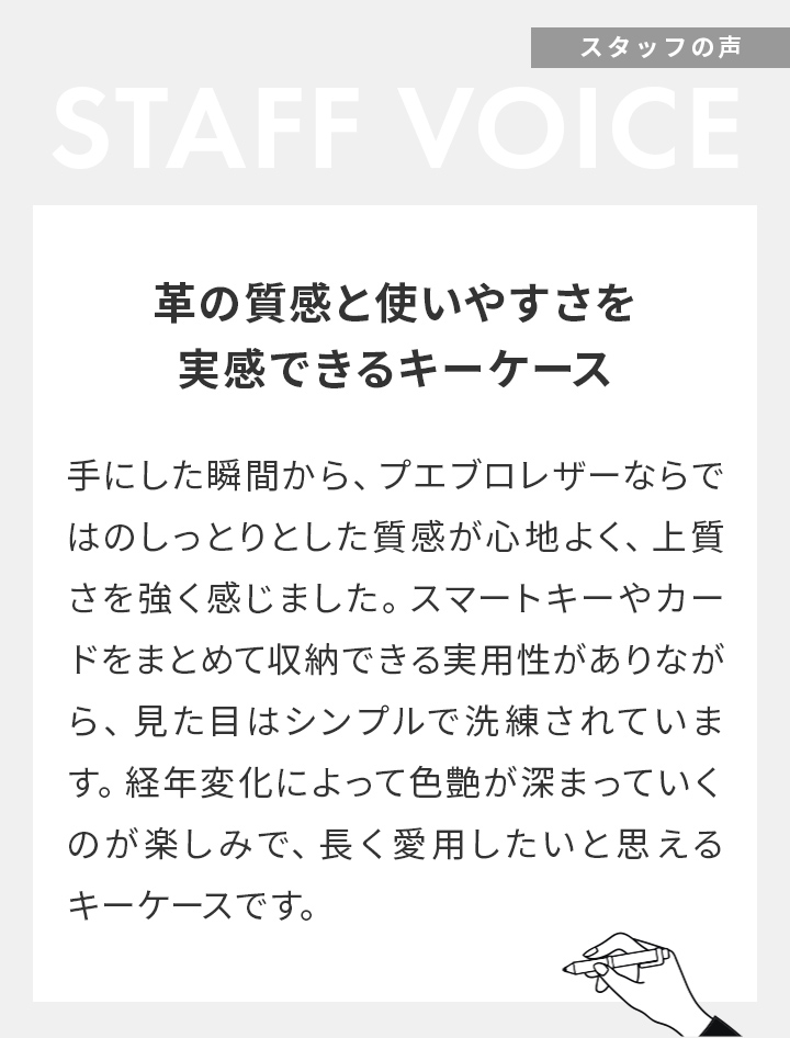 洗練されたデザインと高い実用性を兼ね備えた、大人のためのキーケースです。上質なプエブロレザーを採用し、使うほどに艶と深みを増す経年変化をお楽しみいただけます。大型のスマートキーやカードをすっきりと収納でき、シンプルでありながら品格のある佇まいに仕上げています。日常をさりげなく格上げする、上質な革小物です。