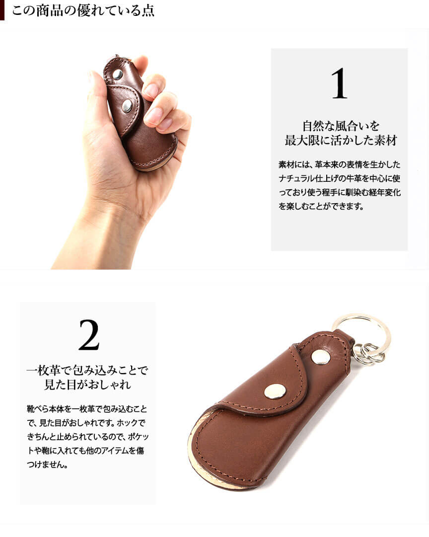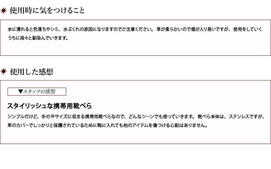 【サイズ】 収納時:約 縦10.5×横4.5×厚み0.7mm 【重さ】 約34g 【素材】 タンニン鞣しの牛革 【生産国】 バングラディッシュ 【仕様】 外出の時に本当に便利な携帯用靴べらです。
